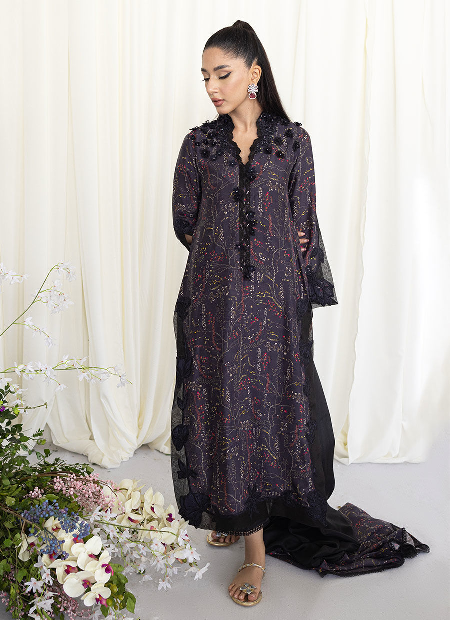 Cut from pure, breathable raw silk, the universally flattering silhouette is a deep onyx hue. Whimsical florals bloom all over the shirt, while the hand stitched 3-D flowers all along the neckline add timeless, easy elegance. The hemline and sleeves are appliqued with embroidered organza, making this an Eid essential. A pure medium silk dupatta with thick printed borders, completes your ensemble for a stand out look.