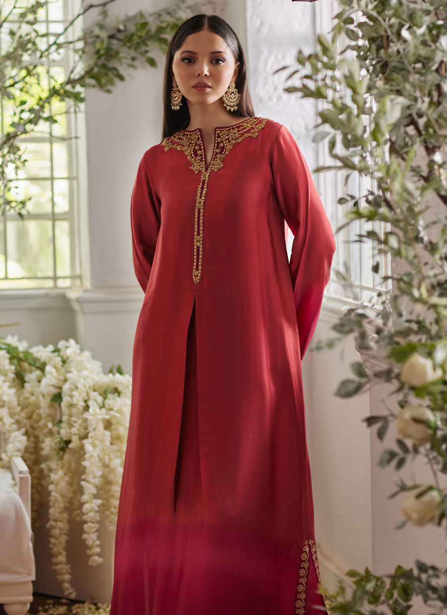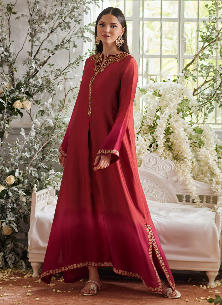 The neckline and sleeves have gold hand work to add a sparkly touch of elegance. Complete your look with our matching raw silk pants (as shown) and sophisticated straight hair for a stand out look in a show stopping ensemble.