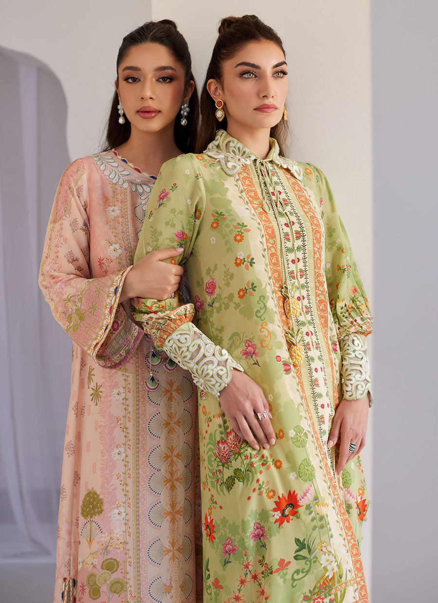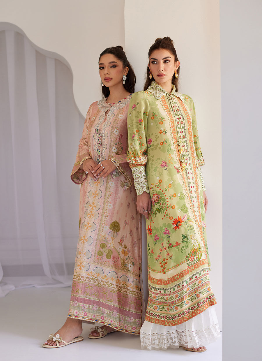 Our latest kaftan is a confection of charm — drenched in sugary hues of ivory and pale pink, and splashed with whimsical florals that feel like spring in motion. Cut from airy crepe, it flows effortlessly with every step, making it your go-to for instant impact with zero effort.