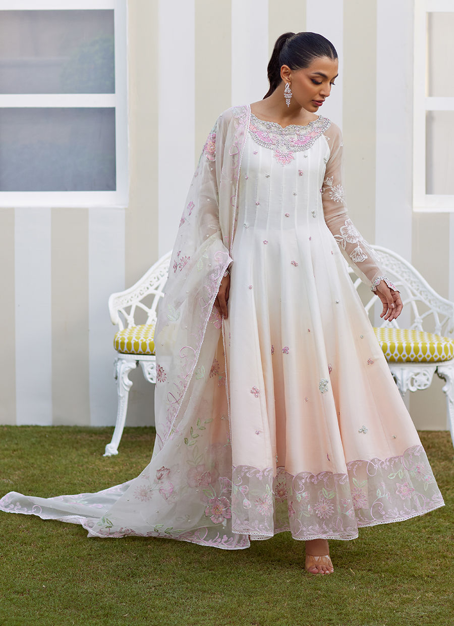 This ombré kalidaar in dreamy off-white and pale peach is cut from pure raw silk and radiates quiet luxury. The neckline is adorned with intricate silver zardozi and appliqué work, creating a luminous focal point. Tiny 3D florals are delicately scattered across the front, while an embroidered organza border graces the hem for a fluid, romantic finish. The sheer organza sleeves are embroidered and accented with zardozi at the openings, blending softness with ornate detail, The ensemble is complete with a diaphanous organza dupatta—adorned with embroidered florals, a delicate pearls scattered all over with scalloped edges that epitomize with elegance. Pair yours with a matching raw silk izaar featuring a coordinated embroidered border.