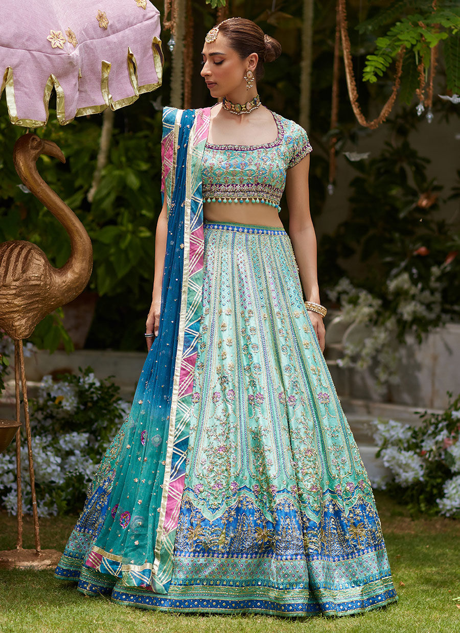 Embrace the dawn of your new beginning with "Asel," a formal masterpiece that blends delicate beauty with ethereal elegance. A meticulously crafted printed lehenga choli adorned with intricate handwork. The flattering neckline and bodice are intricately hand worked with glimmering pale gold gota, nakshi, sequins, dabka and pearls. The floral printed kalis cascade down from the delicately hand worked bodice adding graceful movement and that unforgettable drama. The most striking part of this ensemble is the gorgeous, intricately hand worked back (which can be customized for more coverage). The outfit is completed with an ombre aqua blue pure net dupatta embellished with heavy sitara chann and finished with gota. Asel's magic lies in the intricate dance of light and texture. Asel’s more than just an outfit; it's a timeless expression of love and light. This breathtaking ensemble is perfect for the bride who desires a modern twist on tradition, all while shimmering in the glow of her special day.