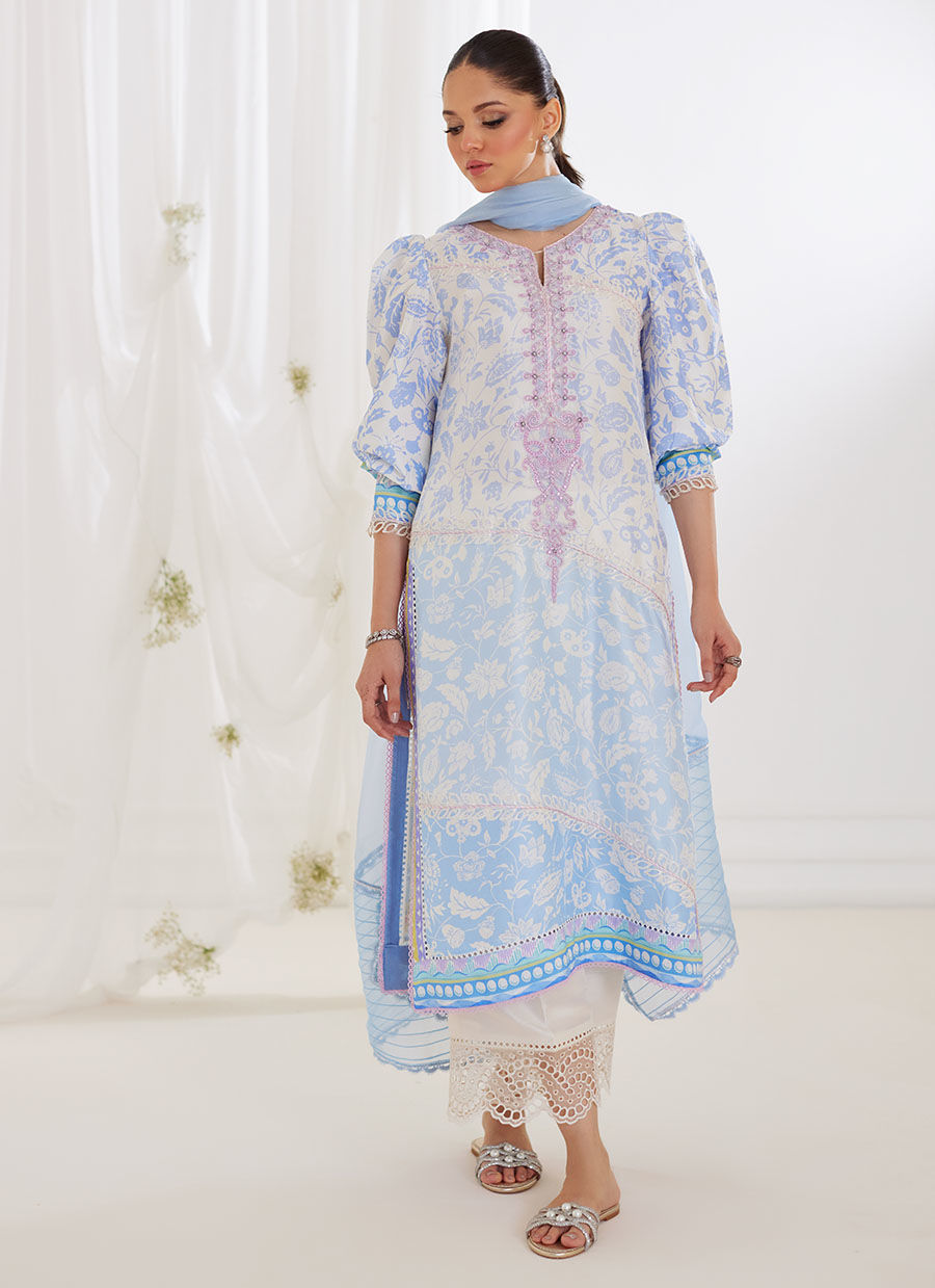 The graceful relaxed fit shirt is paired with a periwinkle, pure chiffon dupatta with organza detailing.