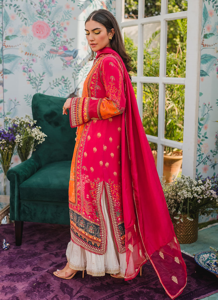 Cut from pure, breathable crepe silk, the universally flattering silhouette will become your forever favourite! A deep striking scarlet hue, with eye catching pops of zingy tangerine is further enhanced with hand embellished pearls and sequins. Intricate zari hand embroidery along the neckline and daaman adds timeless, easy elegance.