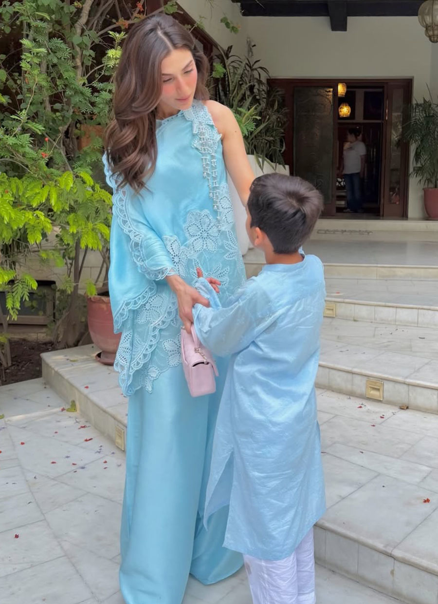 Minimal, luxe, and straight out of a fashion girl’s moodboard — Marlene is your ultimate modern festive layer. This blue statement jacket features bold schiffli-inspired cutwork detailing, giving it that clean, high-end, couture feel while still staying light and wearable. Paired with wide-leg raw silk pants, Marlene is perfect for Eid mornings, chic dinners, and those days when you want to serve elegance with a cool-girl edge.