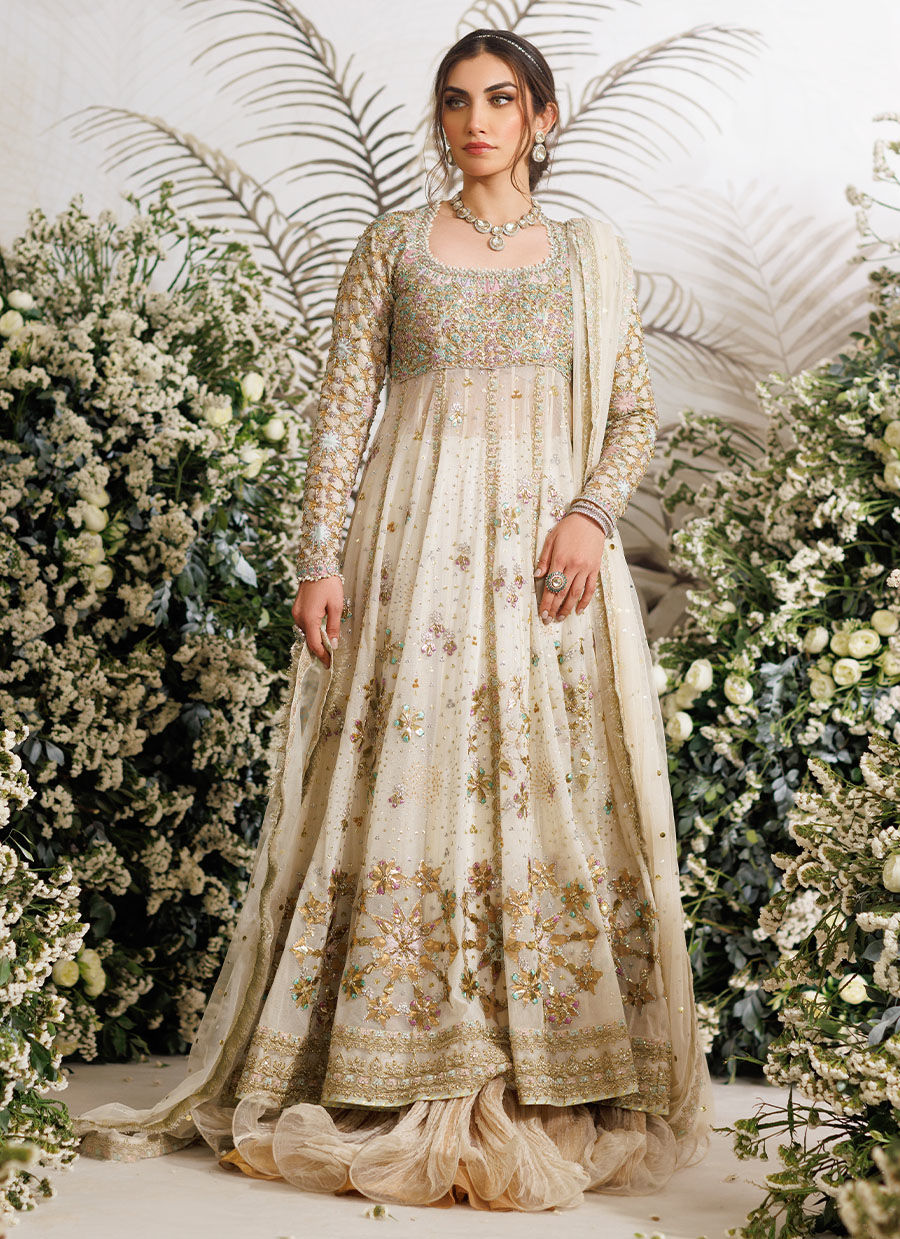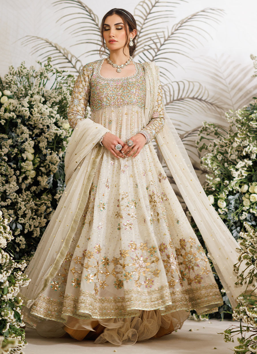 The gorgeous sheer kalidaar is layered over a subtly shimmering, zari tiered lehgna for an incredible flair and an amazingly flattering silhouette. A cascading pure net dupatta is hand embellished with shimmering gota and kaamdaani and an embroidered border make this the ideal choice for intimate occasions.