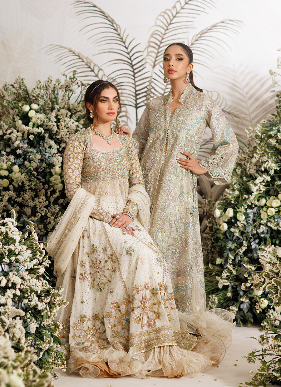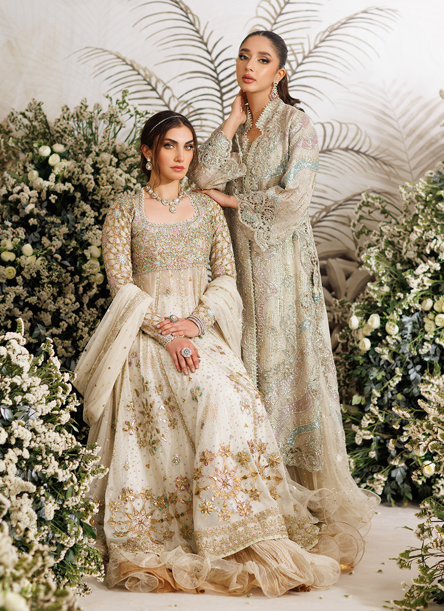 Farah Talib Aziz evokes feelings of romance, unabashed femininity and the grandeur of times past with majestic, flowing silhouettes and cascading dupattas.