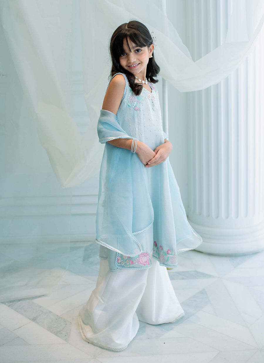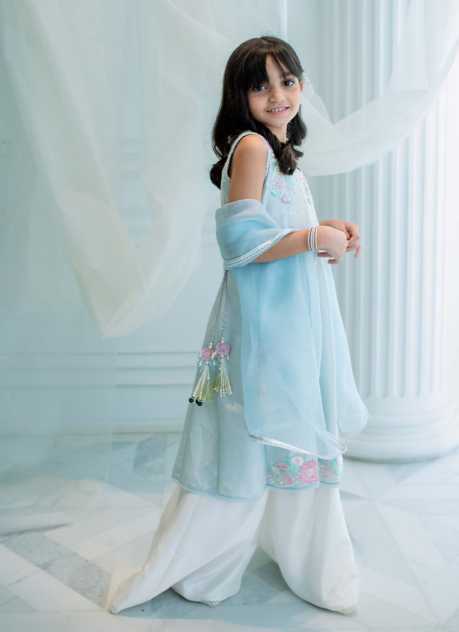 The perfect princess addition to your little girls wardrobe. Cut from pure silk, this gorgeous ensemble, in an icy blue hue, is going to be your perfect solution for all special occasions.