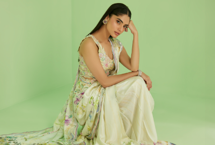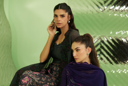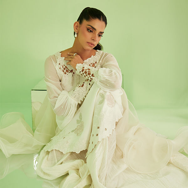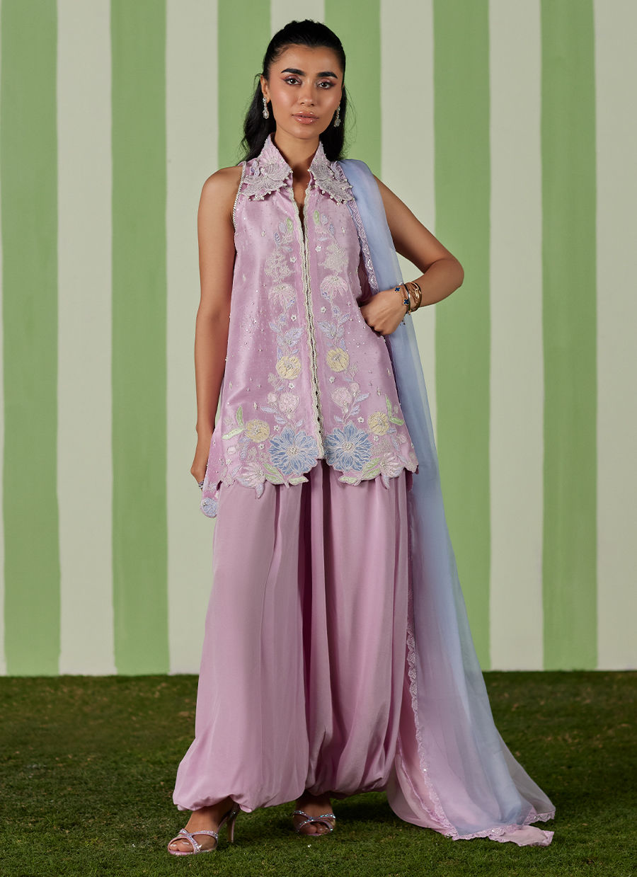 A blush-toned dream you’ll want to wear on repeat — effortless, elegant, and so FTA. Deeba features a blush pink short top adorned with intricate appliqué work and delicate floral motifs, elevated with an embellished collar and refined finishing for a polished look. Paired with soft balloon pants for a modern, flowy silhouette, the ensemble is completed with a dreamy ombré chiffon dupatta, edged with lace detailing for that perfect touch of feminine charm — ideal for Eid celebrations, festive gatherings, and intimate occasions