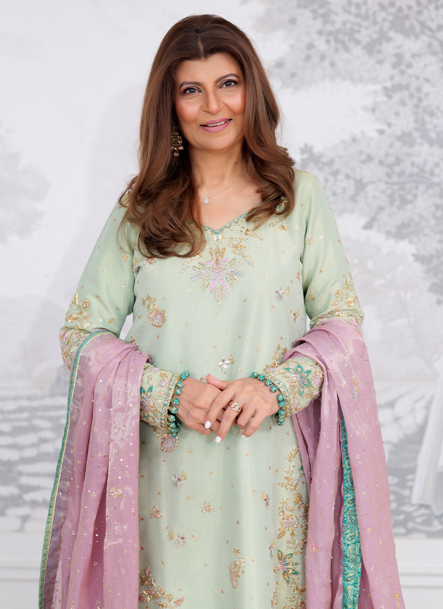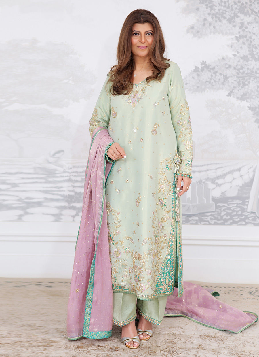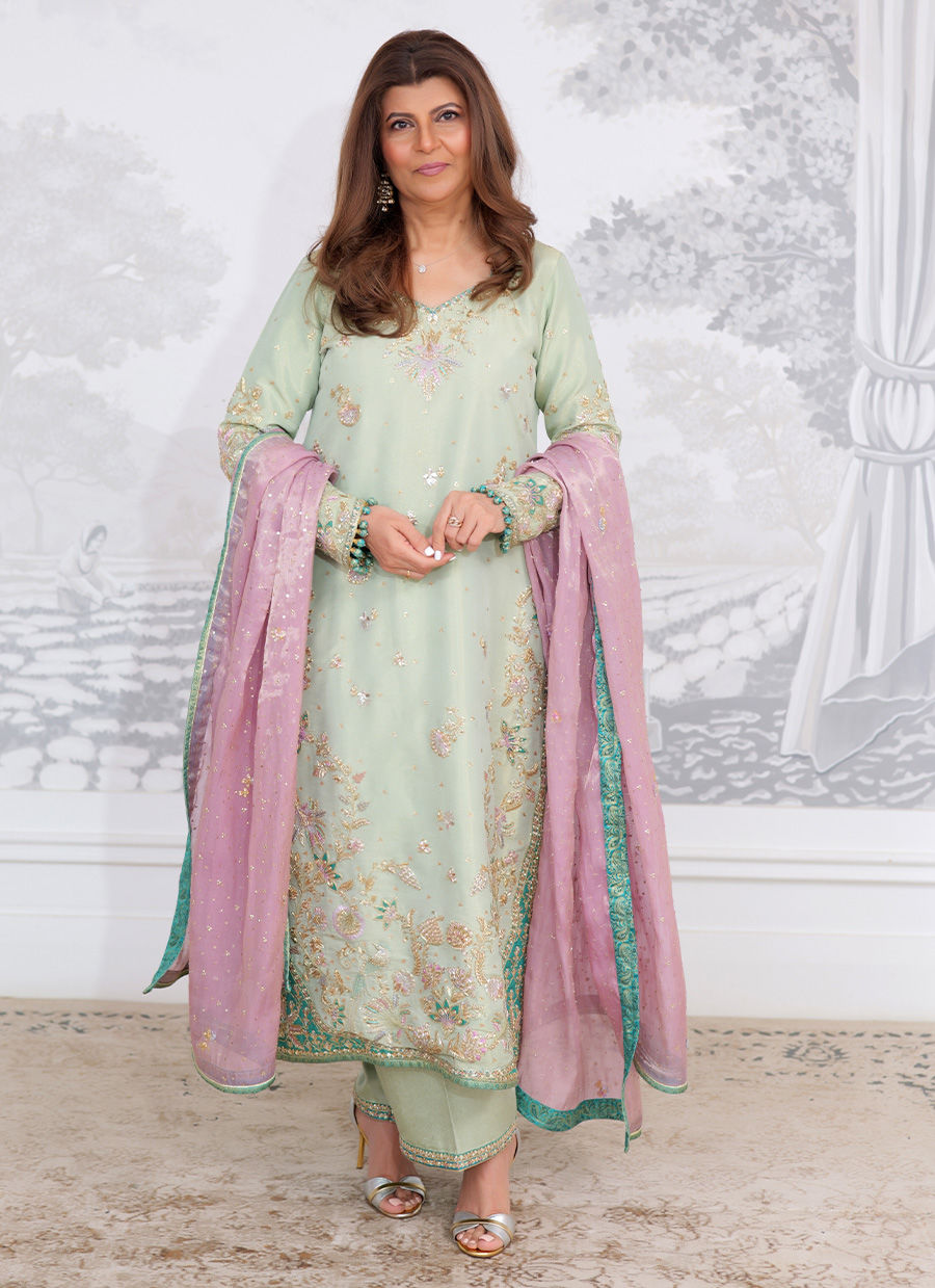 A delicate ensemble in soothing mint green, adorned with exquisite hand embellishments in resham, sequins, and zari. The kurta features finely embroidered floral motifs, with shimmering accents across the neckline, sleeves, and daaman that lend a touch of understated elegance. The look is paired with a dreamy lilac dupatta, finished with intricate embroidery and a contrasting turquoise border that adds depth and vibrance to the outfit. This ensemble beautifully balances soft pastel hues with traditional craftsmanship, making it a timeless choice for festive and formal occasions.