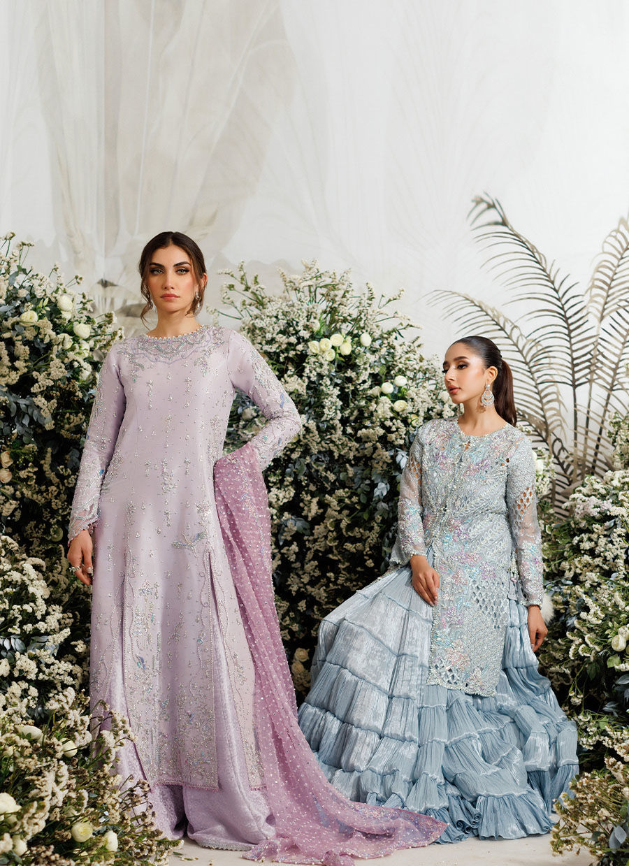 This zari silk kalidaar is in a delicate pale lilac hue which makes it an ideal choice for year around festivities. It has an absolutely gorgeous round neckline, embellished with intricate floral handwork of silver kora, dabka. Delicately hand embellished with sequins and Swarovski crystals to help you shine out amongst the crowd. Intricately hand worked floral motifs along the front of the shirt are designed to have heads turning everywhere.