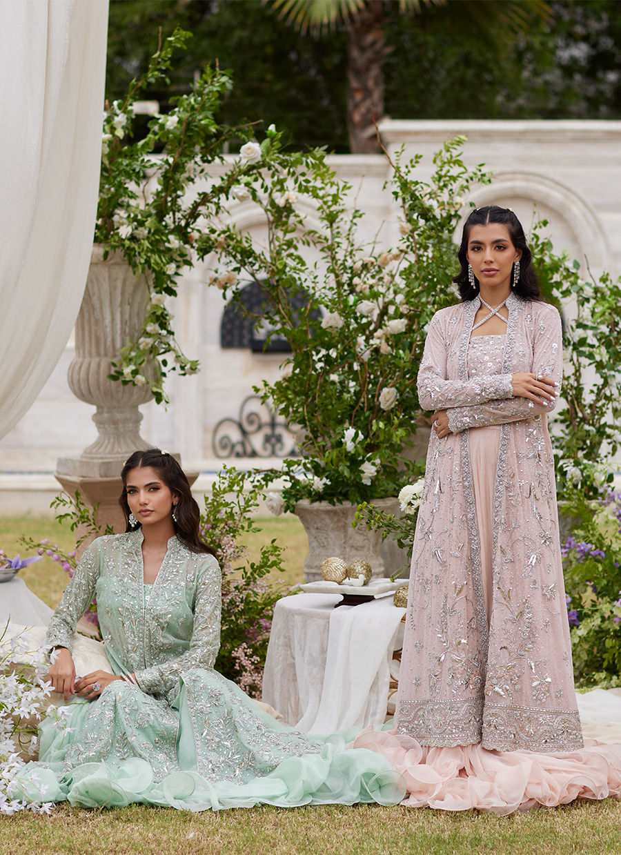 Ethereal and fluid, this pale turquoise ensemble blends delicate detail with dramatic movement. The sheer net jacket shimmers with mukaish, kora, dabka, sequins, and crystals—each embellishment catching the light with subtle brilliance. Beneath, a zari silk bustier blooms softly with tiny silver zardozi flowers, adding quiet intricacy. Completing the look, the 25-yard chiffon, seafoam swirl lehnga billows with effortless volume, creating a silhouette that feels both airy and majestic—a modern statement in timeless craft.