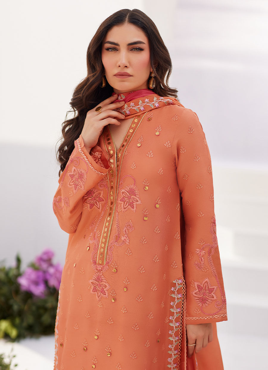 A fresh coral hue is richly embroidered with silk thread work in tonal salmon pink hues and while the universally flattering neckline is adorned with glimmering gold kaam daani. Delicate embroidered motifs add the perfect amount of glamour.