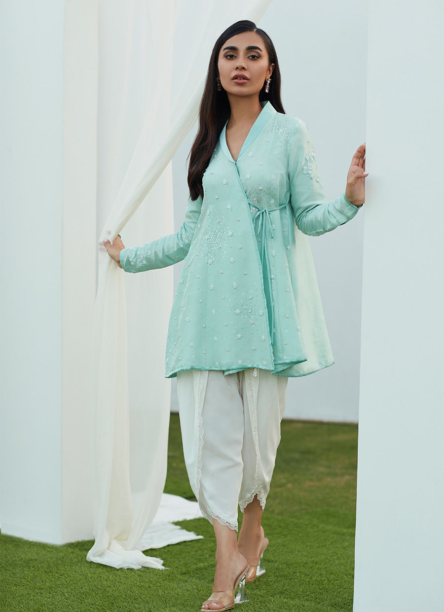 Delicately embroidered, with sequins and pearl hand embellishments. The thigh skimming wrap top that loosely cinches at the small of your waist creates a fabulously flattering effect.