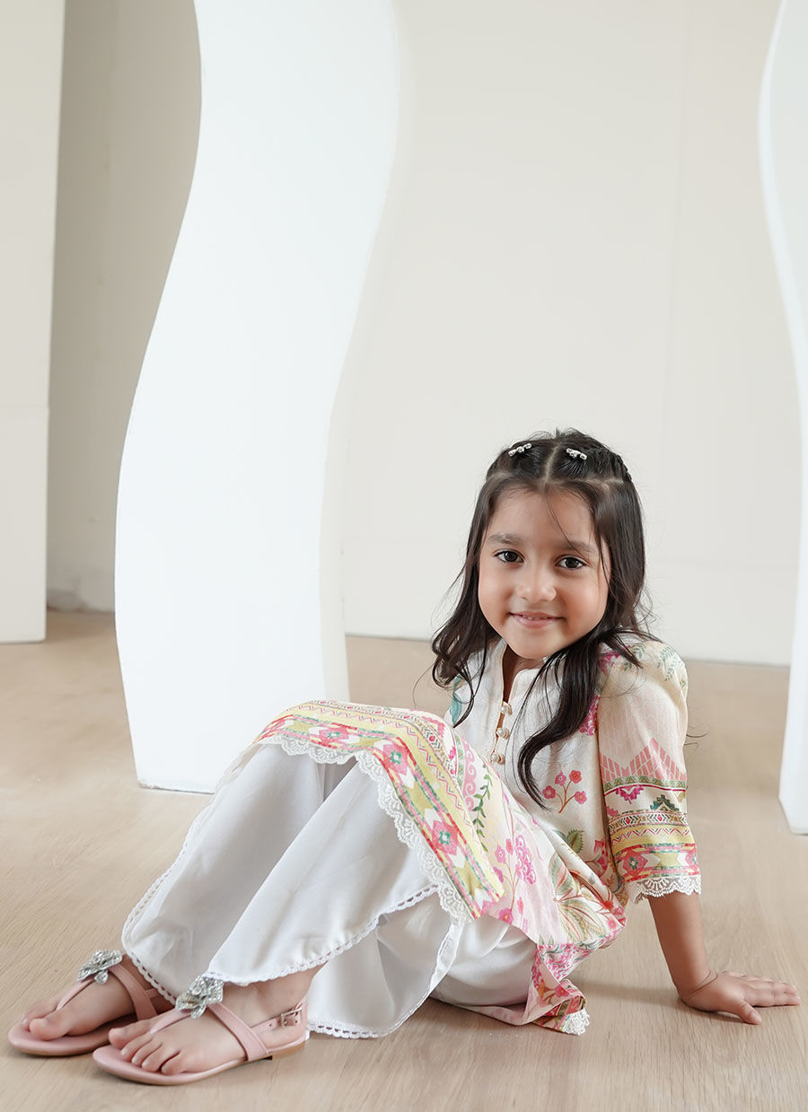Rendered in pure raw silk and adorned with delicate floral motifs, this straight kurta and shalwar set for young girls captures the essence of youthful grace. Set against a romantic canvas of pale pink, the ensemble radiates warmth and light, evoking a sense of joy and serenity. The kurta features soft pleating that adds gentle movement and a touch of sophistication, while its airy, sleeveless cut ensures comfort and ease. Paired with a matching shalwar, the look is a harmonious blend of classic tradition and contemporary charm. With its subtle sheen and elegant detailing, this set is a timeless choice for festive occasions, perfect for the young girl who delights in understated beauty.
