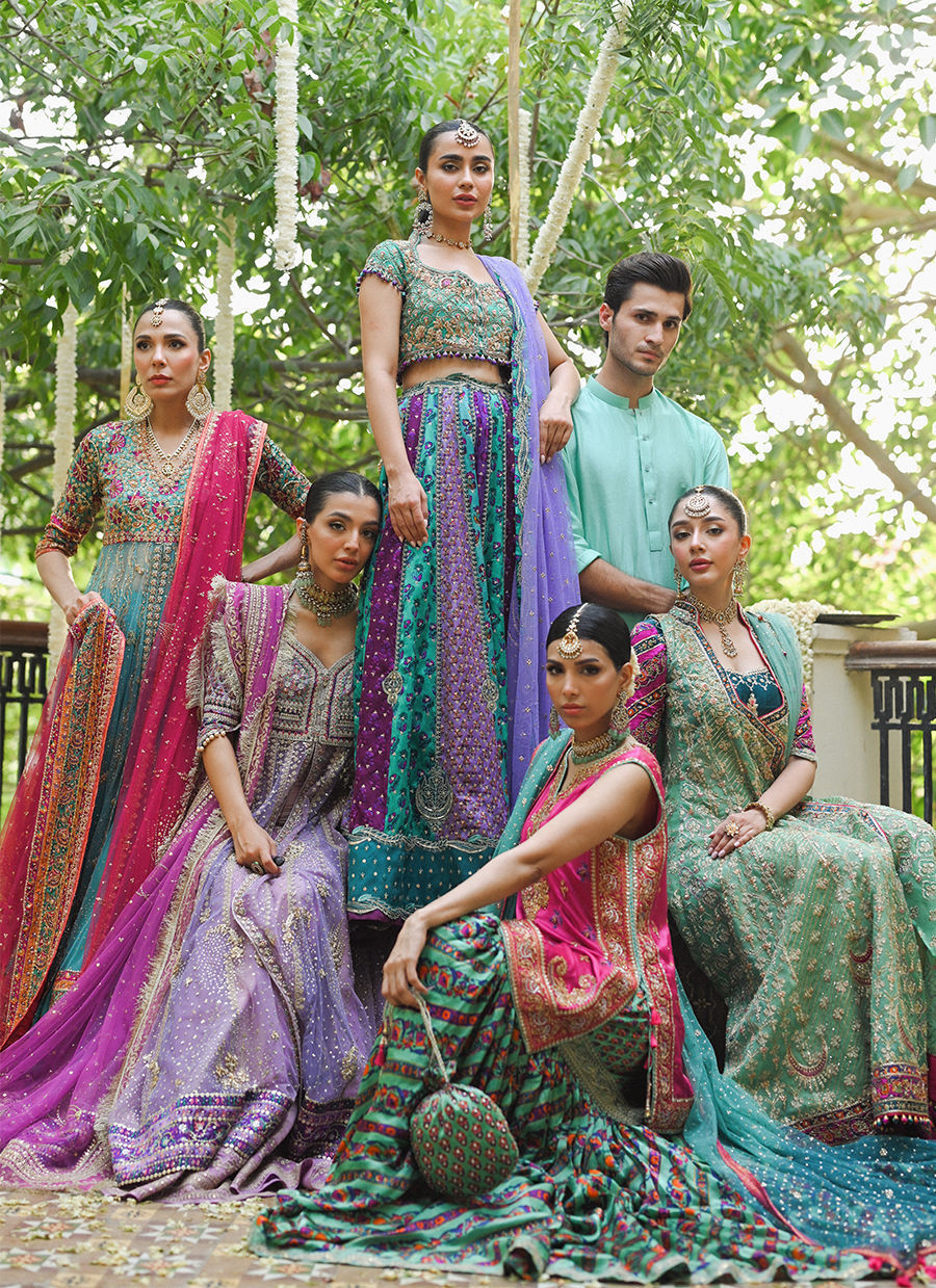An absolute show stopper! A stunning ferozi embroidered organza angrakha, enriched with intricate handwork and applique detailing. The angrakha features a blue applique border and hand blocked magenta and blue sleeves and daman border, adding a vibrant and detailed contrast to the ferozi base. Paired the angrakha is a ferozi zari fabric lehenga, which showcases a hand blocked border in pink and blue hues. The lehenga's design complements the angrakha seamlessly, enhancing the overall ensemble's sophistication and visual appeal. To complete the outfit, a ferozi net dupatta with sitara chann all over is draped gracefully. The dupatta is adorned with a hand embellished appliqued border on all sides, adding a touch of traditional craftsmanship and elegance. Colorful tassels and finishing’s are intricately added to the sides of the dupatta, providing an extravagant and celebratory finish to the ensemble. This ensemble is a perfect choice for special occasions, combining intricate detailing, vibrant colors, and luxurious fabrics to create a truly mesmerizing and memorable look.