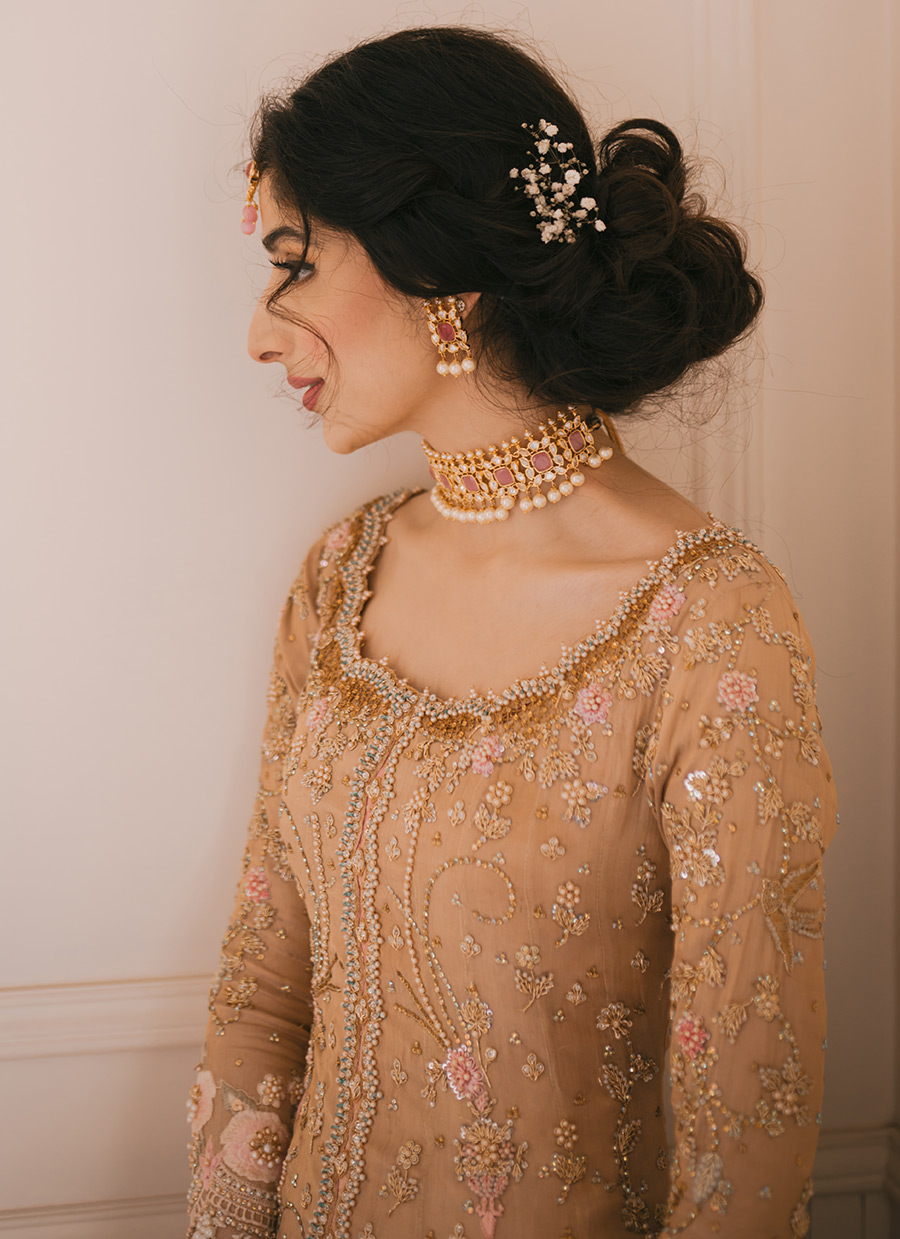 Cascading swathes of rose gold silk, joining to create a flowing kalidaar, laden with meticulously handworked embellishment in glimmering gold. A deliciously sheer pure organza dupatta, delicately hand-embellished with sequins and pearls. For subtly glamorous bride, shimmering in rose gold.
