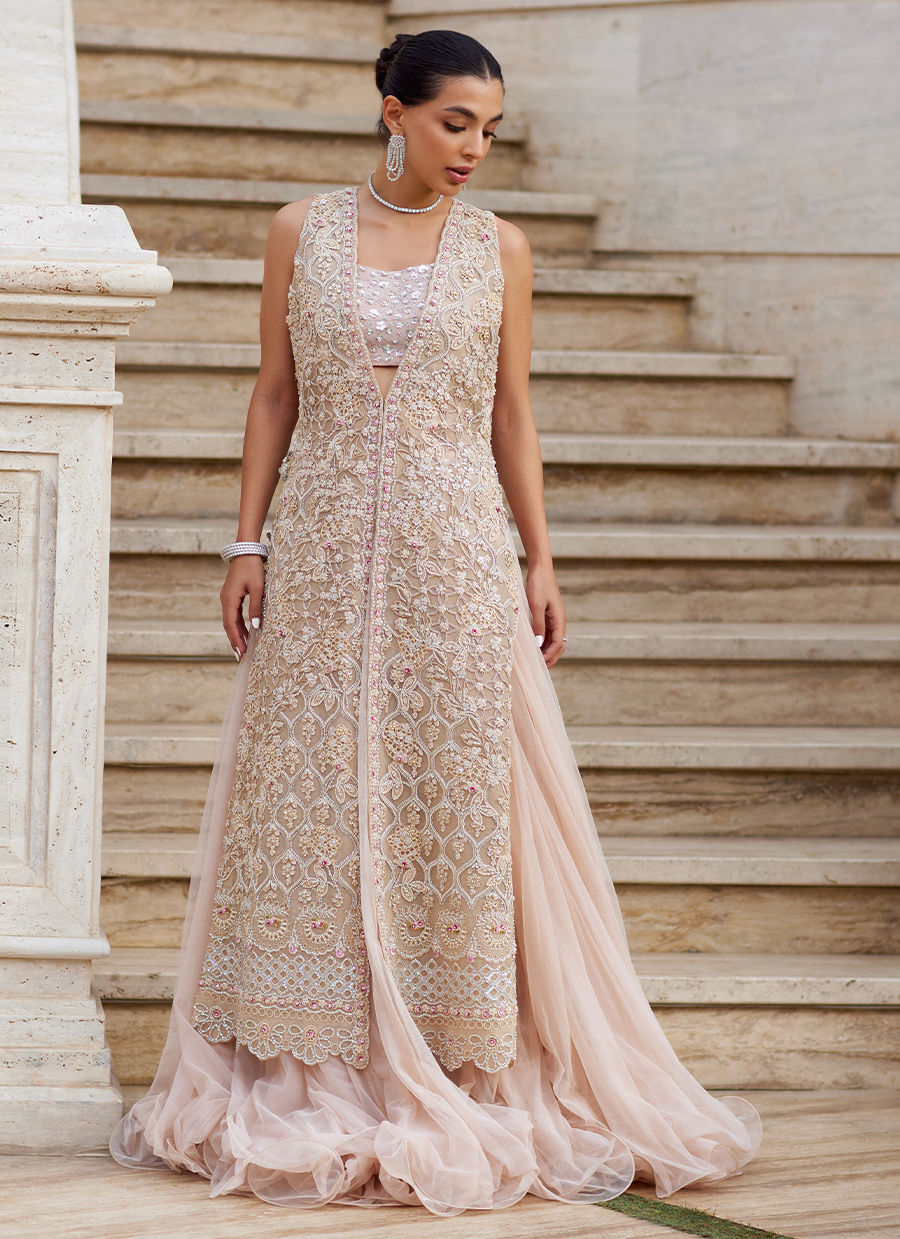 A monochrome moment in a soft sandy hue, this ensemble embodies refined elegance and timeless grace. The long, front-open organza jacket, sleeveless and straight-cut, is adorned with delicate cutwork, further elevated by hand embellishments of pearls, Swarovski crystals, and soft pink resham embroidery, creating layers of subtle romance. Paired with a voluminous pure net lehnga, with a sea foam swirl finish, the look carries graceful movement and ethereal charm. The ensemble is completed with an intricately hand-worked choli, shimmering in silver, adding a statement note of sophistication. A vision of understated luxury, this creation celebrates the power of tonal harmony — classic, graceful, and eternally modern