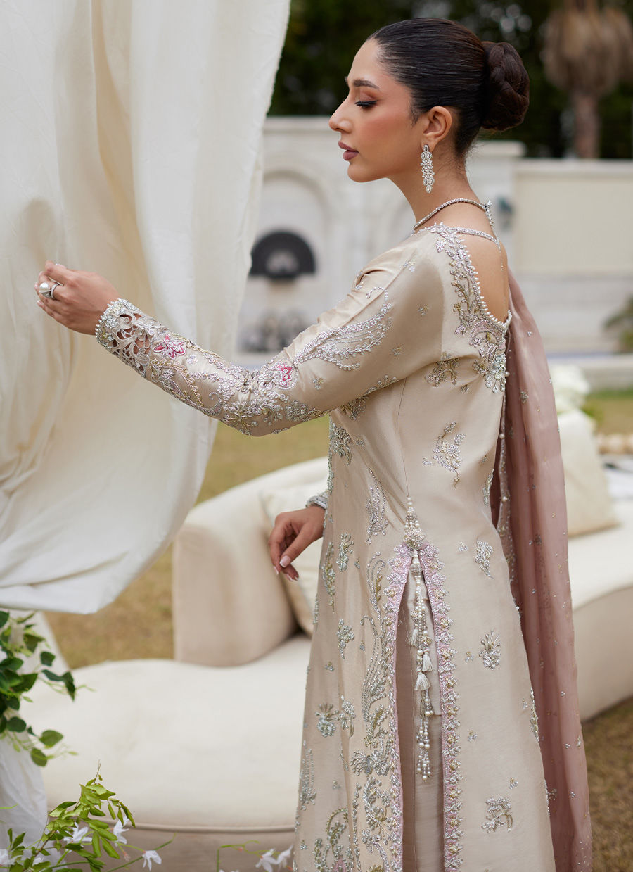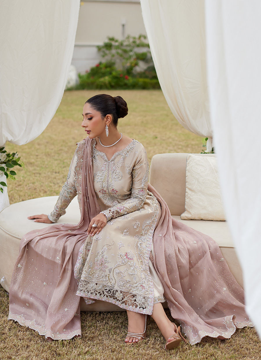 In soft champagne gold, this ensemble radiates quiet sophistication with an heirloom quality. The straight tissue shirt glimmers with intricate handwork — kora, dabka, sequins, crystals, and raw silk appliqué — each detail enhancing the luminous texture of the fabric. Paired with a voluminous raw silk dhaka pajama, the silhouette feels graceful yet rooted in tradition. A blush-toned zari silk dupatta softens the palette, draping the look in a romantic finish. Subtle yet striking, this piece is designed for celebrations that call for understated luxury.
