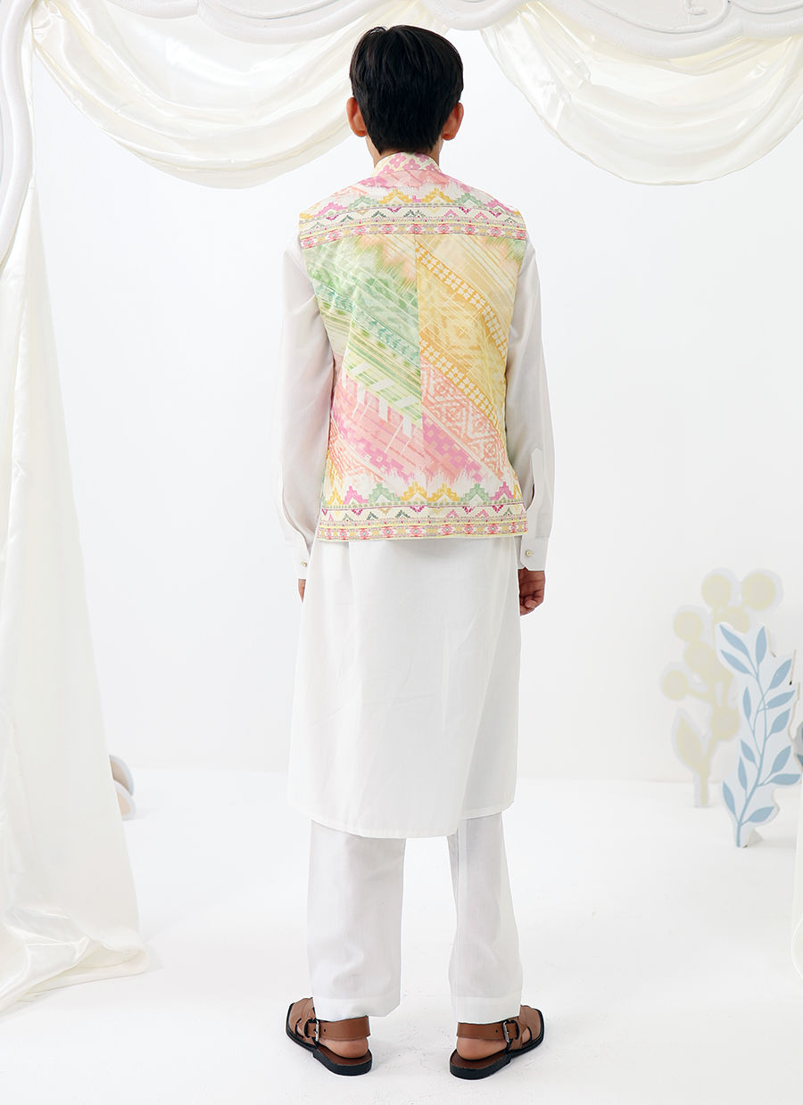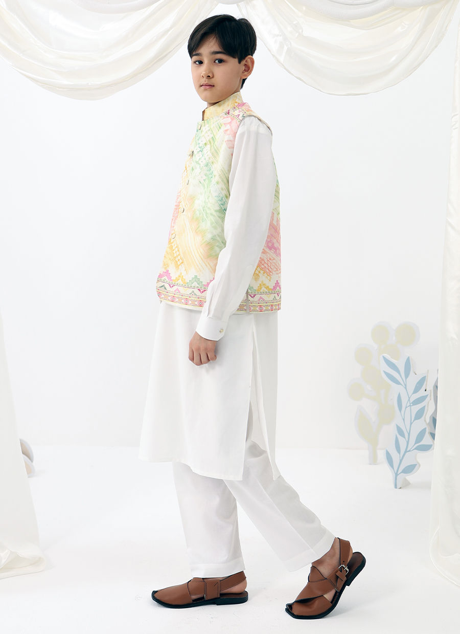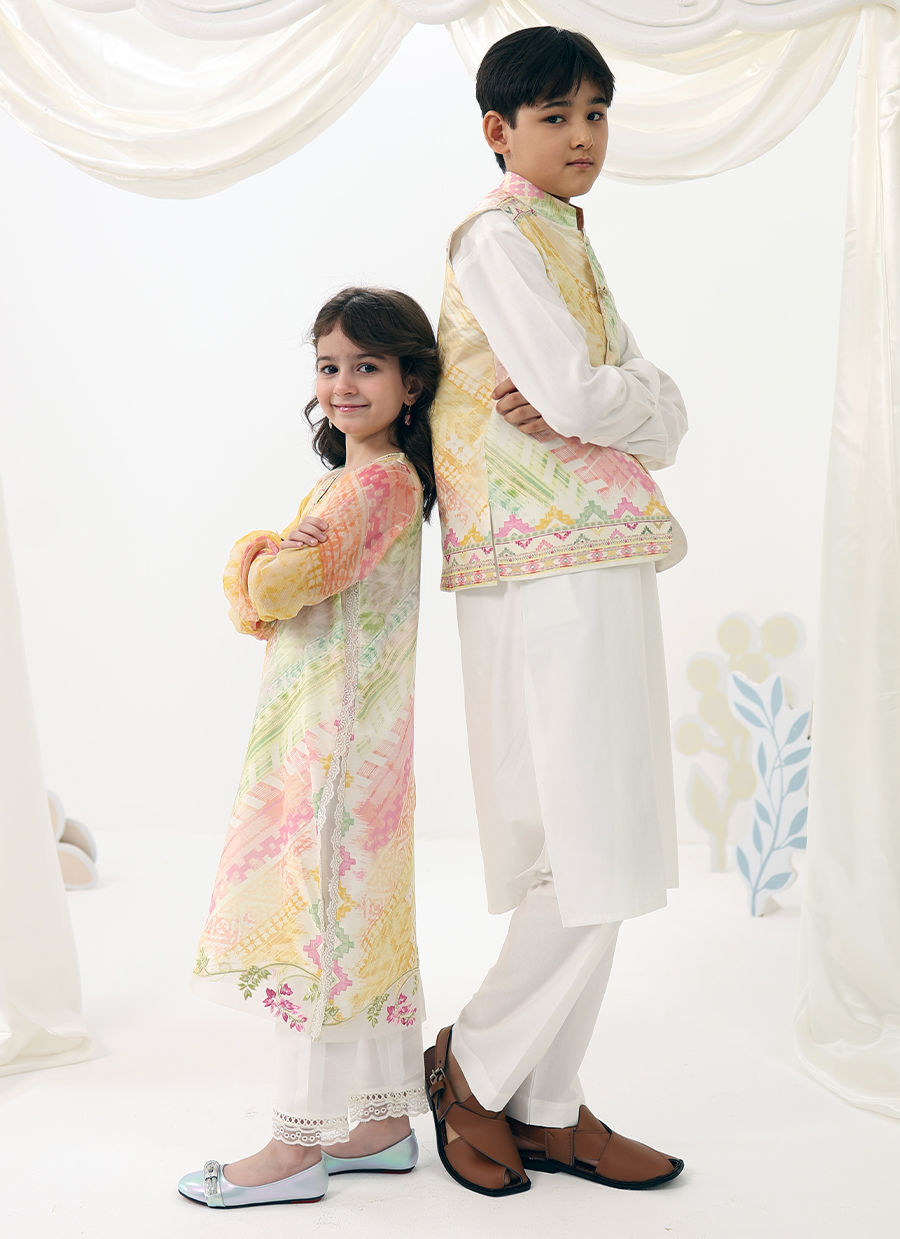 Ilyas Mini is a refined festive look designed for little gentlemen. Featuring a crisp white kurta shalwar paired with a softly printed waistcoat, this ensemble blends traditional charm with a fresh pastel palette for a polished yet playful finish.