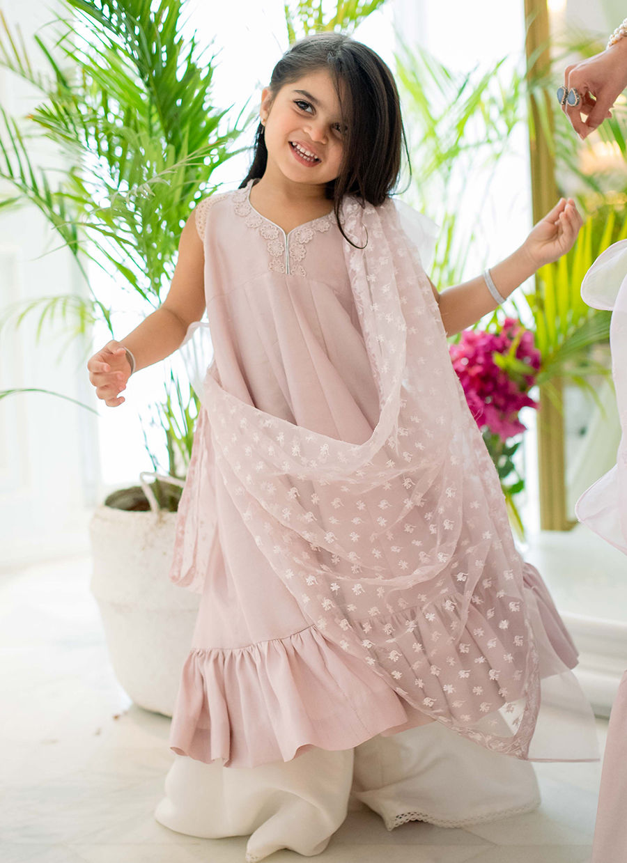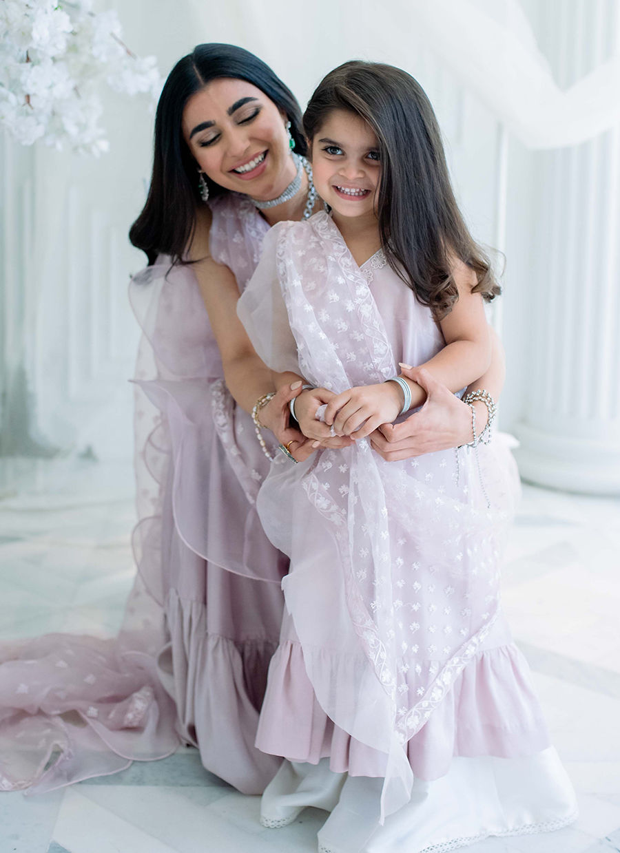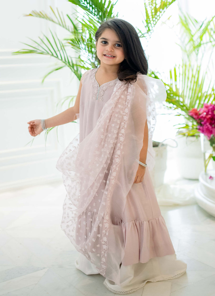 The perfect princess addition to your little girl's wardrobe! Dress your mini-me in the ultimate twirl worthy ensemble to make her feel on top of the world! A cute flowing kalidaar, in the dreamiest shade of lilac is cut from sumptuous raw silk, and adorned with silk thread work, hand embellished 3D florals, as well as, shimmering Swarovski crystals, sequins and pearls along the neckline.