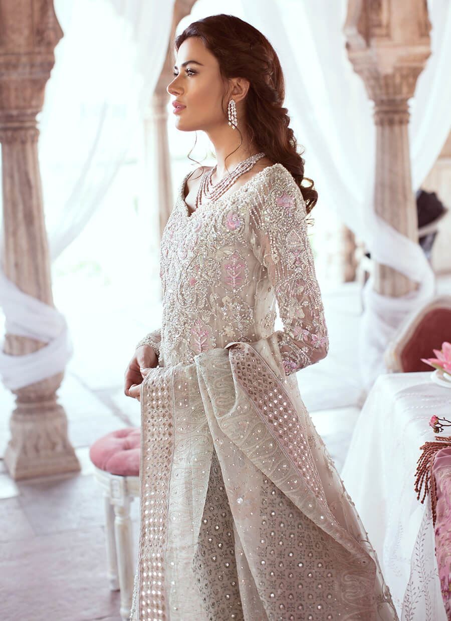 Timeless elegance entwined onto opulent fabric. Pristine long shirt worked with pearls, beads and embellished with Swarovski crystals is accentuated with a touch of pastel colors. It is paired with a block print dupatta on organza and comes with complementary pants.