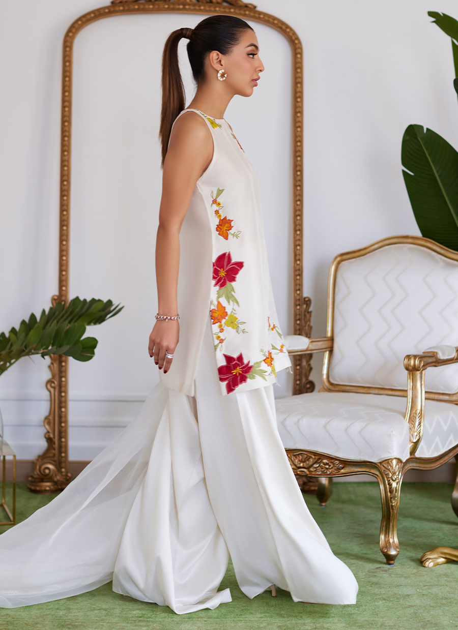 This effortlessly chic and classy ivory silhouette will declare you the best dressed wherever you go. Absolutely fitting for the spring season, the pure raw silk short shirt features a round neckline that sits close to the neck with a flattering incut armholes and thigh high slits. It is appliqued with vibrant embroidered botanical motifs at the neck and hem that brings a kaleidoscope of floral hues that lift the entire fit. Paired with loose voluminous flared pants that accentuate the length of this fit and an organza dupatta with embroidered lace finishing, this look is a true classic of the season.