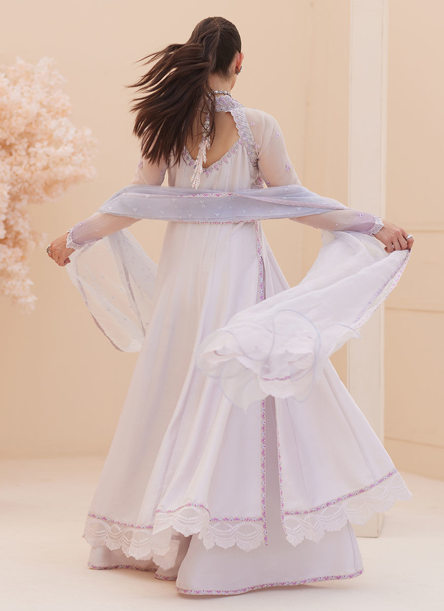 Nothing truly, captures FTA’s feminine, romantic aesthetic more than a romantic, effortlessly flowing kalidaar. Cut from pure silk, this gorgeous ensemble, will be your perfect solution for any and every special occasion. Hand encrusted with an array of delicately shimmering Swarovski crystals, pearls and sequins on the front and back necklines. The sleek glamourous sleeves, cut from organza have a subtle ombre effect and are edged with a beautiful scalloped lace. An airy organza dupatta, finished with a swirly frill adds a distinctly elegant flair to your final look. Pair your ensemble with our pure silk, embroidery trimmed wide leg pants and some statement earrings for that uber-chic, polished vibe.
