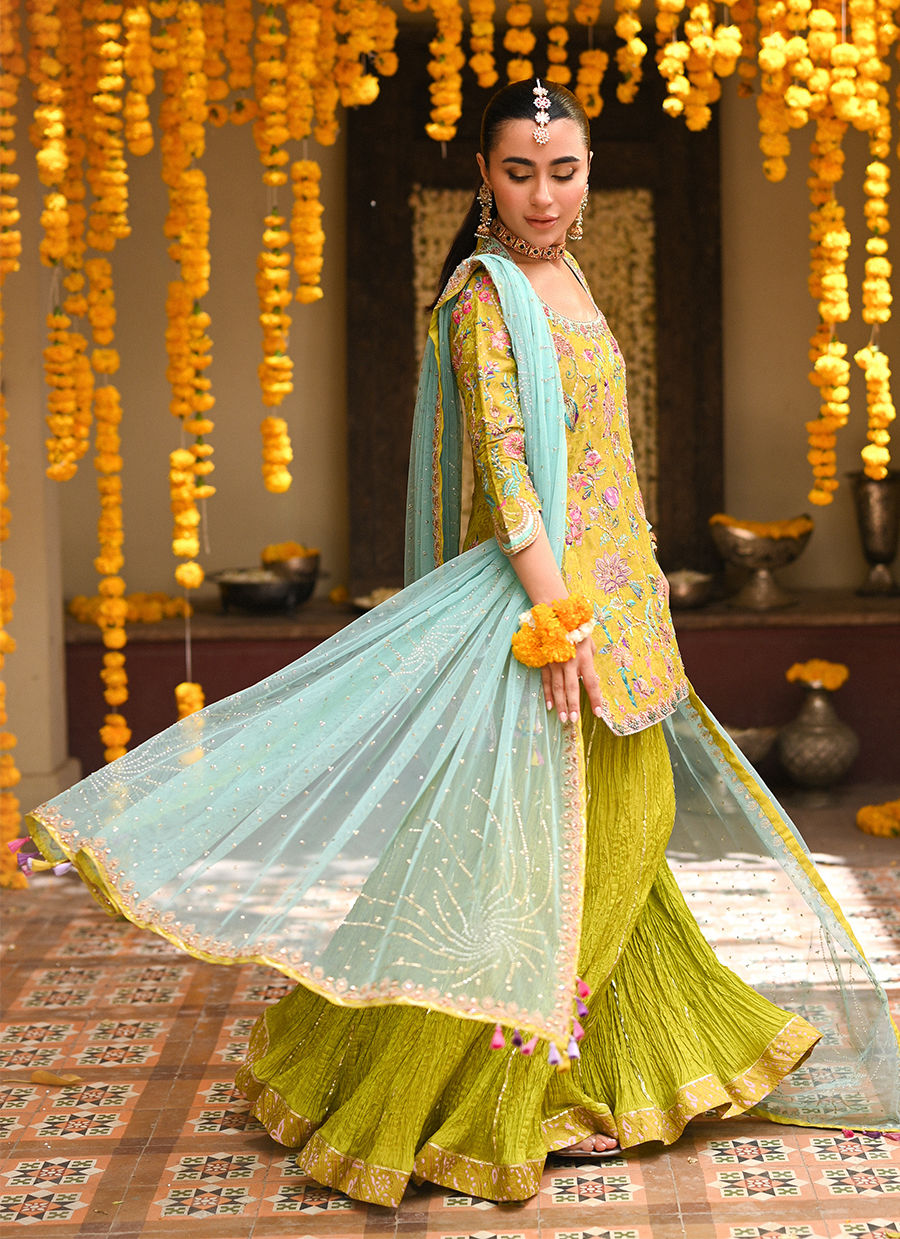 The epitome of a fun and festive outfit, Kisa features a myriad of colors on a kiwi textured zari silk. Adorned with delicate floral embroideries, playful birds, and intricate gota motifs. The zardozi, ari, and thread work, along with raw silk appliques, enhances the design and adds a timeless festive element to the ensemble. The outfit is paired with crushed pure silk Dhaka, finished with a block printed border and gota accents. The look is complete with an embellished ferozi net dupatta, highlighted by embroidery and hand worked borders all around and colorful tassel finishing’s on the corners, adding a playful yet elegant touch.