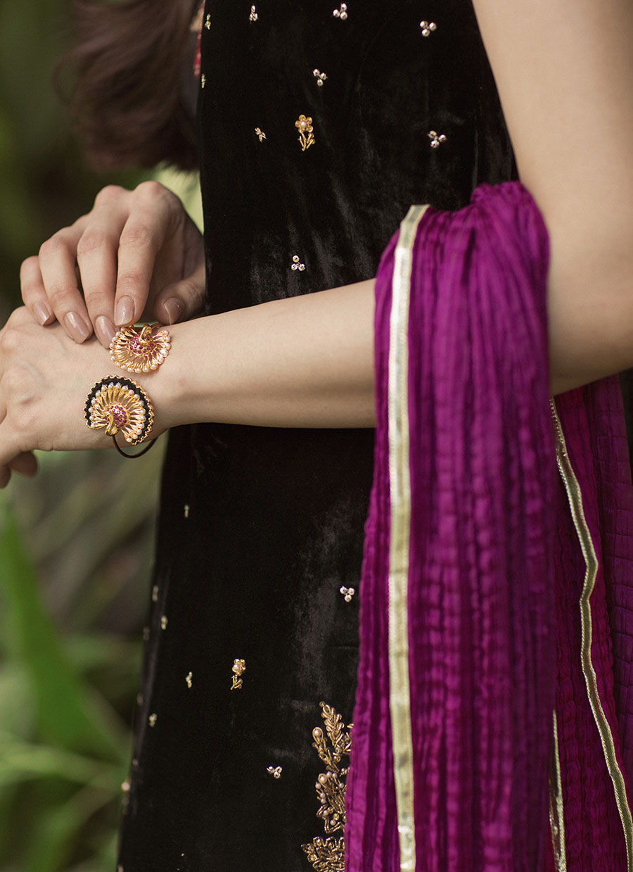 A gorgeous, deep black velvet shirt with an intricately embellished neckline in gold and silk-thread work in shades of emerald, fuschia and magenta. The stunning back has a lovely detailed neckline, sure to make an impact at any event this festive season. Pair your outfit with our delicately embellished velvet izaar and statement earrings for an effortlessly chic look.