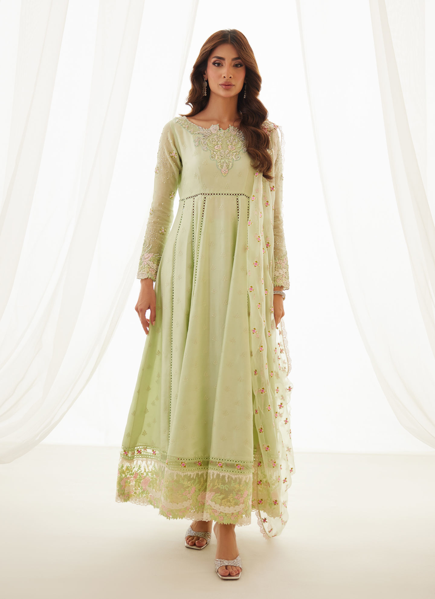 Color: Pale Apple Green Fabric: Shirt: Organza With Schiffli Embroidery, Lehenga: Pure Chiffon, Dupatta: Pure Net, Silhouette/Structure: Peplum Top With Lehenga And Dupatta