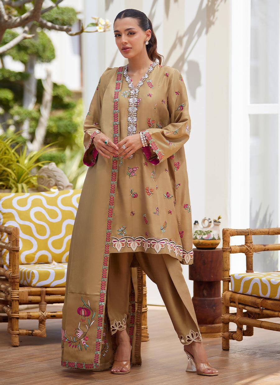 A captivating hue, with a myriad of signature FTA details, to make you stand out amongst the crowd. Cut from pure, breezy raw silk, this A line shirt is sure to become your forever favourite! An earthy beige hue is richly embroidered with silk thread work in uplifting salmon pink, coral and aqua shades, while the universally flattering neckline is adorned with glimmering gold kaam daani. Delicate embroidered motifs and the appliqued border on the hem, add the perfect amount of glamour. A pure medium silk dupatta with embroidered borders completes your ensemble with stunning grace. Pair yours with our coordinated, embroidered shalwar (as shown) and statement earrings for an unforgettable look!!