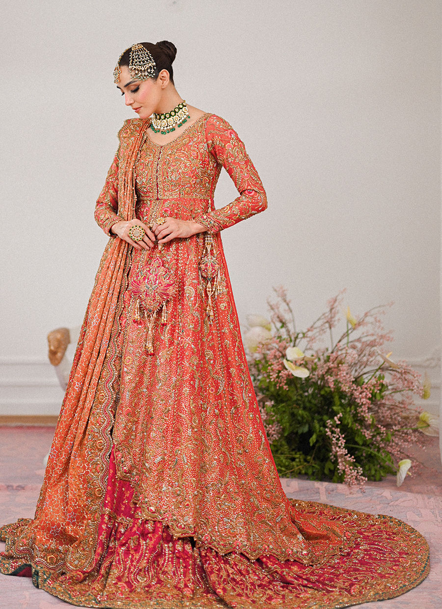 Celebrate the momentous occasion with "Maisha," a bridal ensemble that embodies refined elegance with a touch of modern flair. This captivating outfit features a long, front-open kalidaar shirt in a stunning coral shade, its silhouette exuding timeless beauty. Panels made of pure gold zari that are meticulously adorned with kamdani and kora embroidery, shimmer across the bodice, whispering stories of heritage. Each stitch is a testament to generations of artistry.