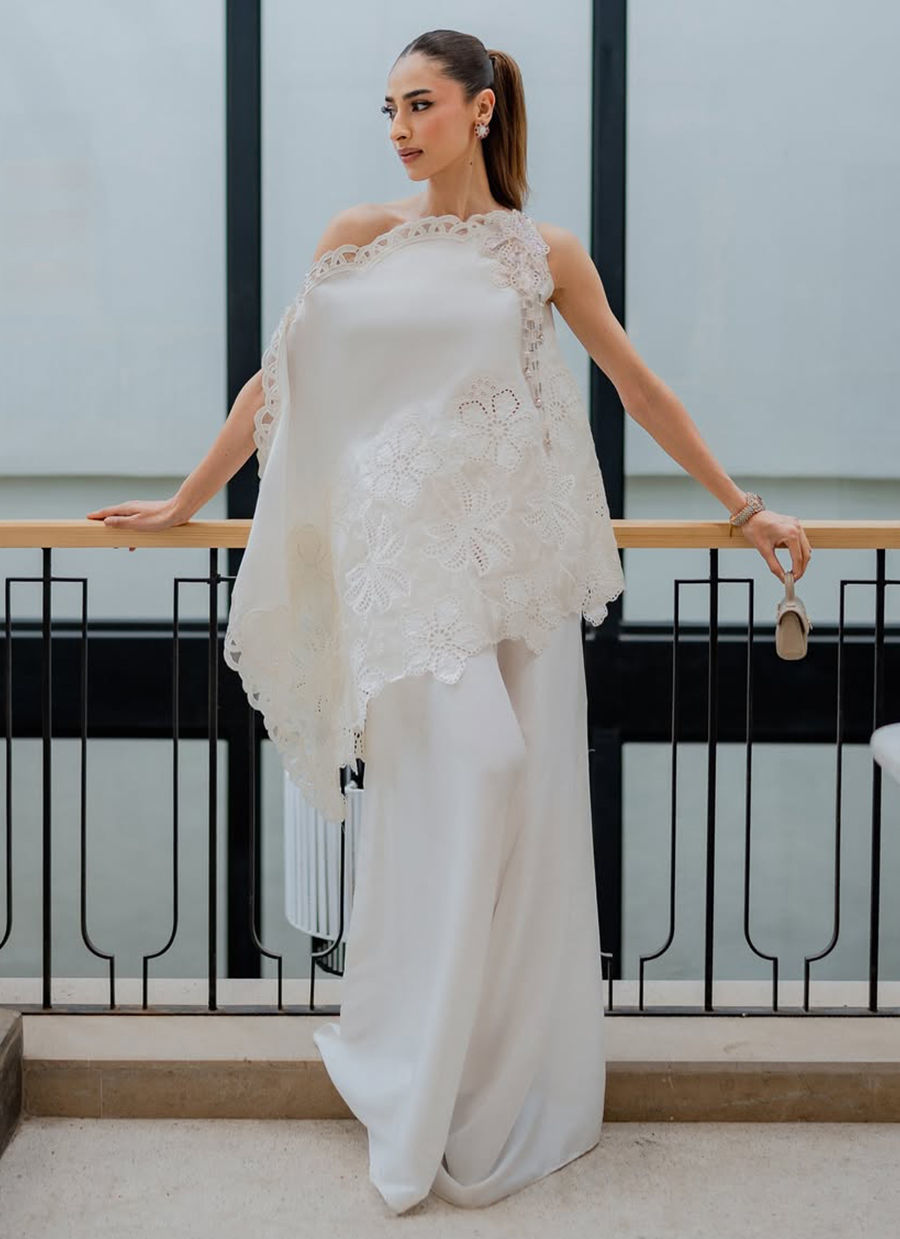 Minimal, luxe, and straight out of a fashion girl’s moodboard — Marlene is your ultimate modern festive layer. This ivory-toned statement jacket features bold schiffli-inspired cutwork detailing, giving it that clean, high-end, couture feel while still staying light and wearable. Paired with wide-leg raw silk pants, Marlene is perfect for Eid mornings, chic dinners, and those days when you want to serve elegance with a cool-girl edge.
