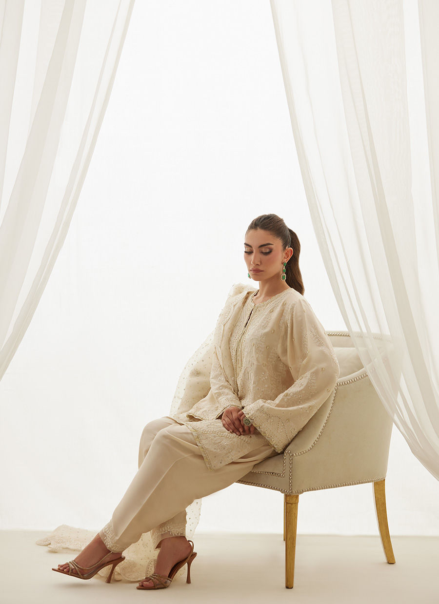 Color: Ivory Fabric: Shirt: Pure Raw Silk, Pants: Raw Silk Tapered Shalwar, Dupatta: Organza