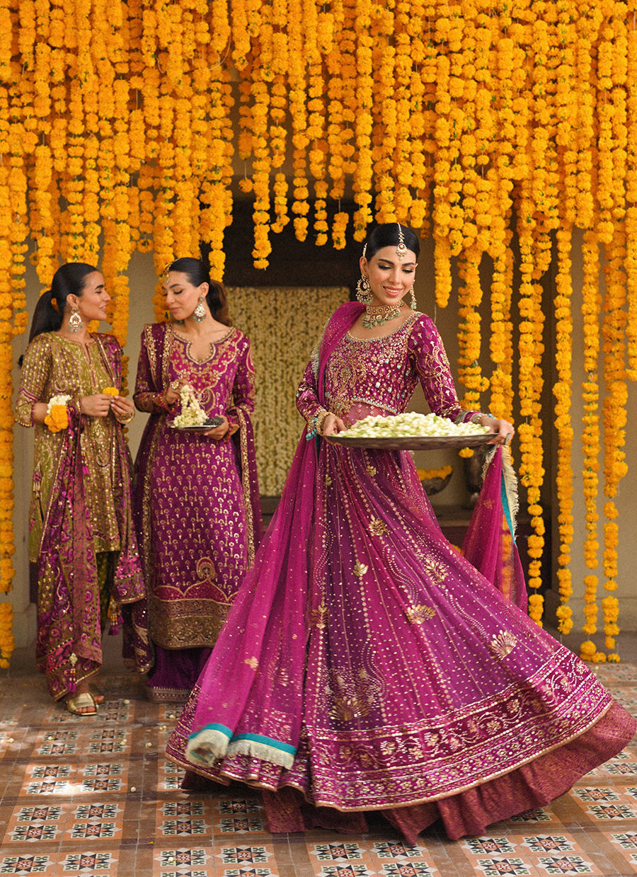 An uber flattering silhouette that gives sleek length to your look. A stunning hand blocked magenta kurta embellished with pink appliques and intricate handwork including kora, dabka, and sitara. This combination creates a rich and textured surface, adding depth and elegance to the outfit. Paired with the kurta is a crushed medium silk magenta dhaka, providing a luxurious and flowing complement to the top. The Dhaka pants is finished with a zari border, enhancing its regal appearance and harmonizing with the kurta. Completing the ensemble is a magenta net dupatta, intricately adorned with sitara chann all over, which lends a subtle sparkle. The dupatta is further embellished with a hand worked border all around, adding a touch of craftsmanship and sophistication. Delicate zari motifs on the corners of the dupatta add a finishing flourish, enhancing its overall beauty. This ensemble is perfect for festive occasions, blending traditional craftsmanship with contemporary design elements to create a sophisticated and captivating look.