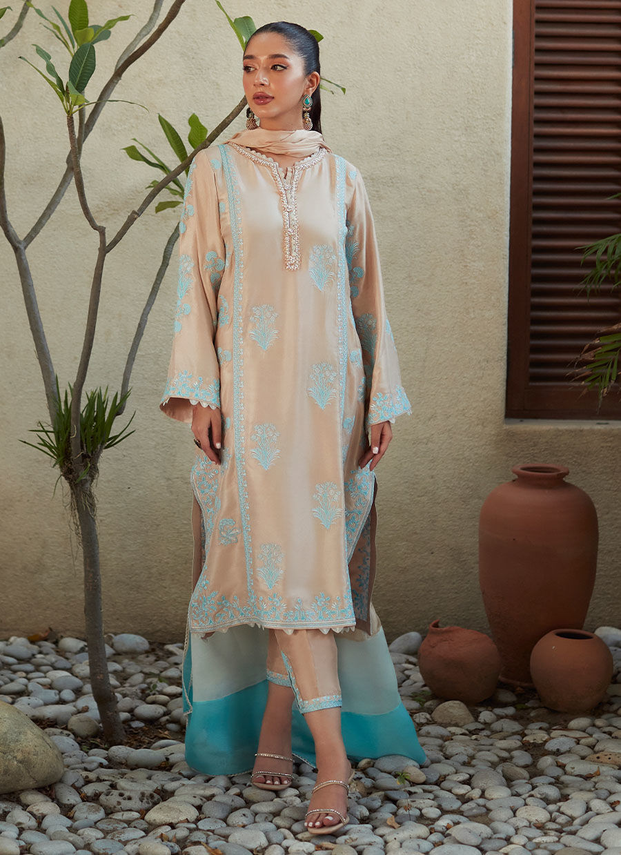 A simple kurta silhouette, with a flattering round neckline, makes the biggest impact. The neckline is adorned with intricate pearl and crystal handwork. The beige medium silk dupatta has shaded turquoise pallus for a playful pop of colour.