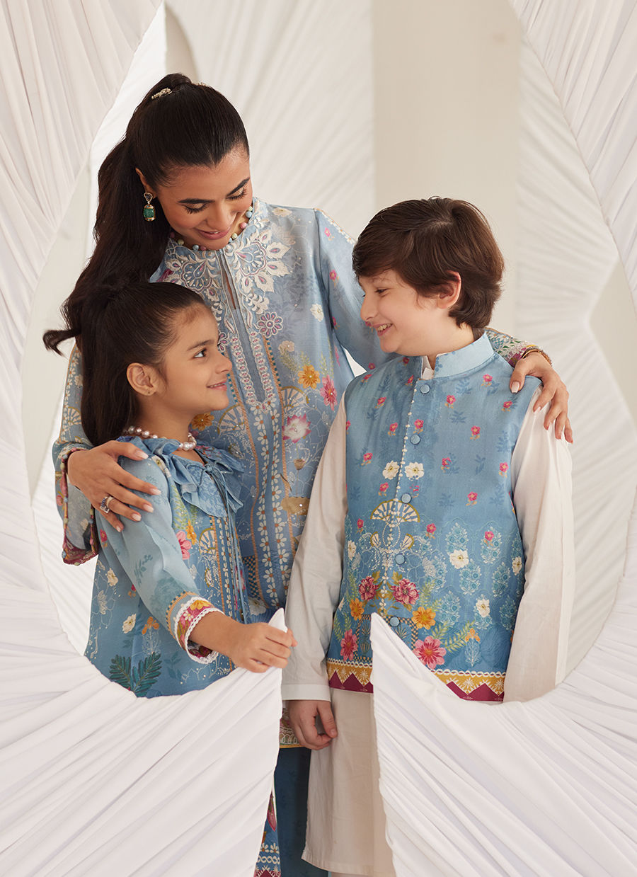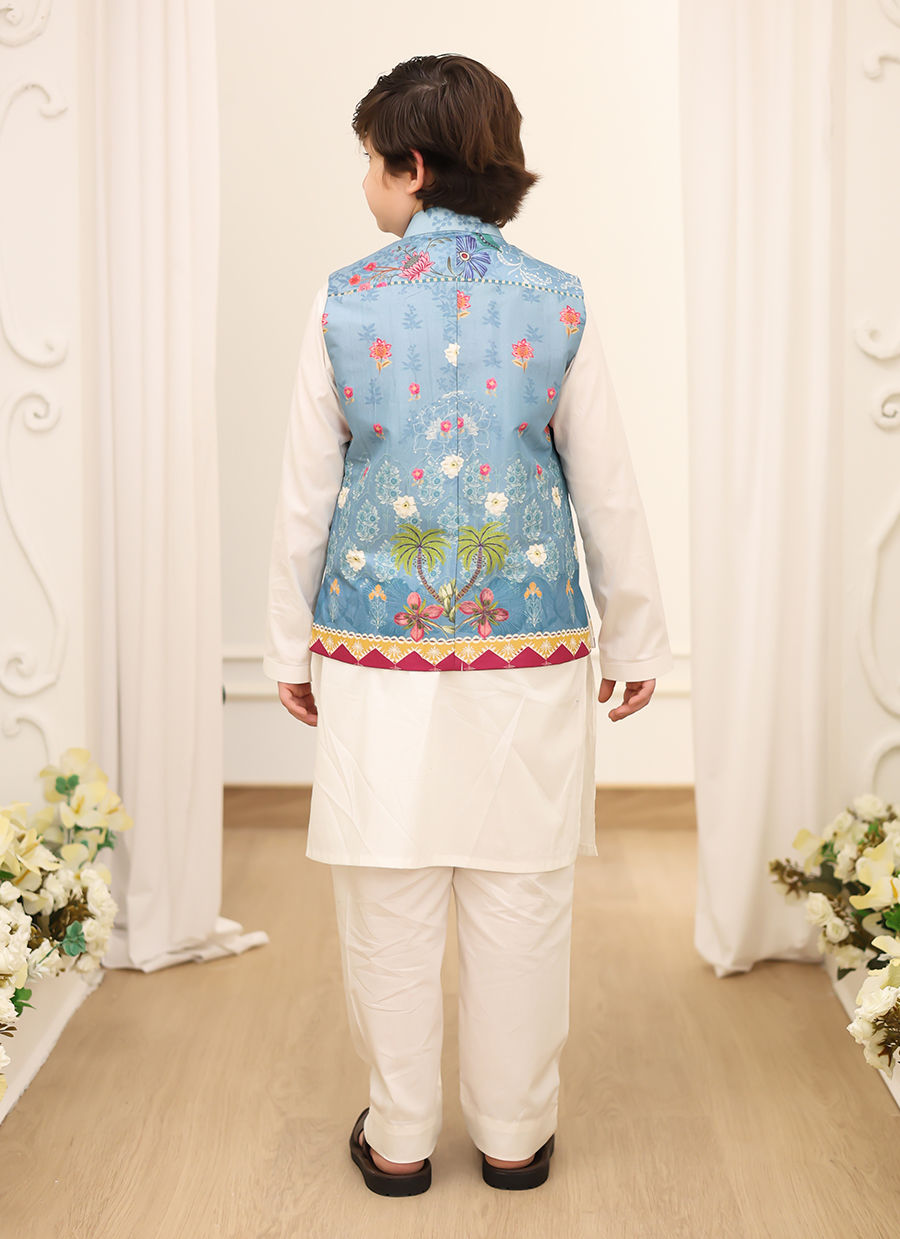 This slate blue printed raw silk waistcoat for young boys is a refined yet stylish option for formal occasions. The deep, sophisticated slate blue color is complemented by an intricate, subtle print that adds dimension and character to the design. The waistcoat features a tailored fit with sleek button fastenings and neat, clean lines, ensuring a polished, modern look. Ideal for pairing with a crisp ivory kurta pajama, this waistcoat brings an elevated touch to any young boy's wardrobe, combining timeless elegance with youthful charm.