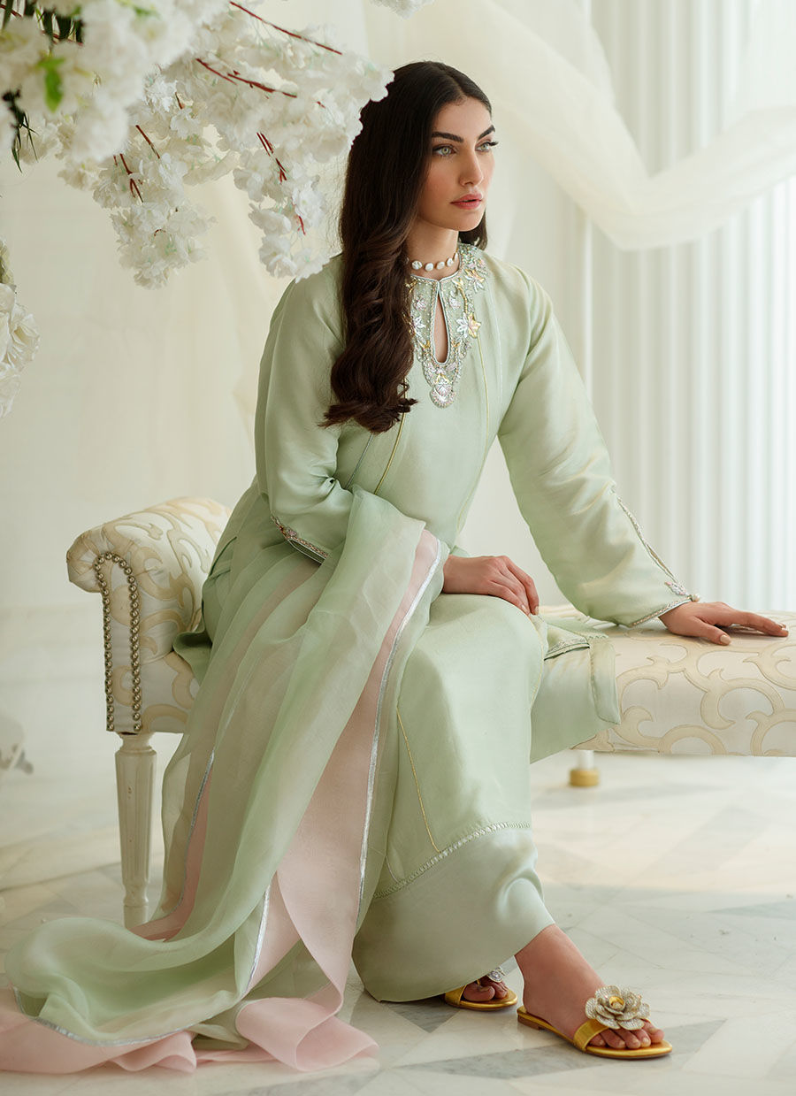 Color: Mint Green Fabric: Raw Silk Work Details: Embellished
