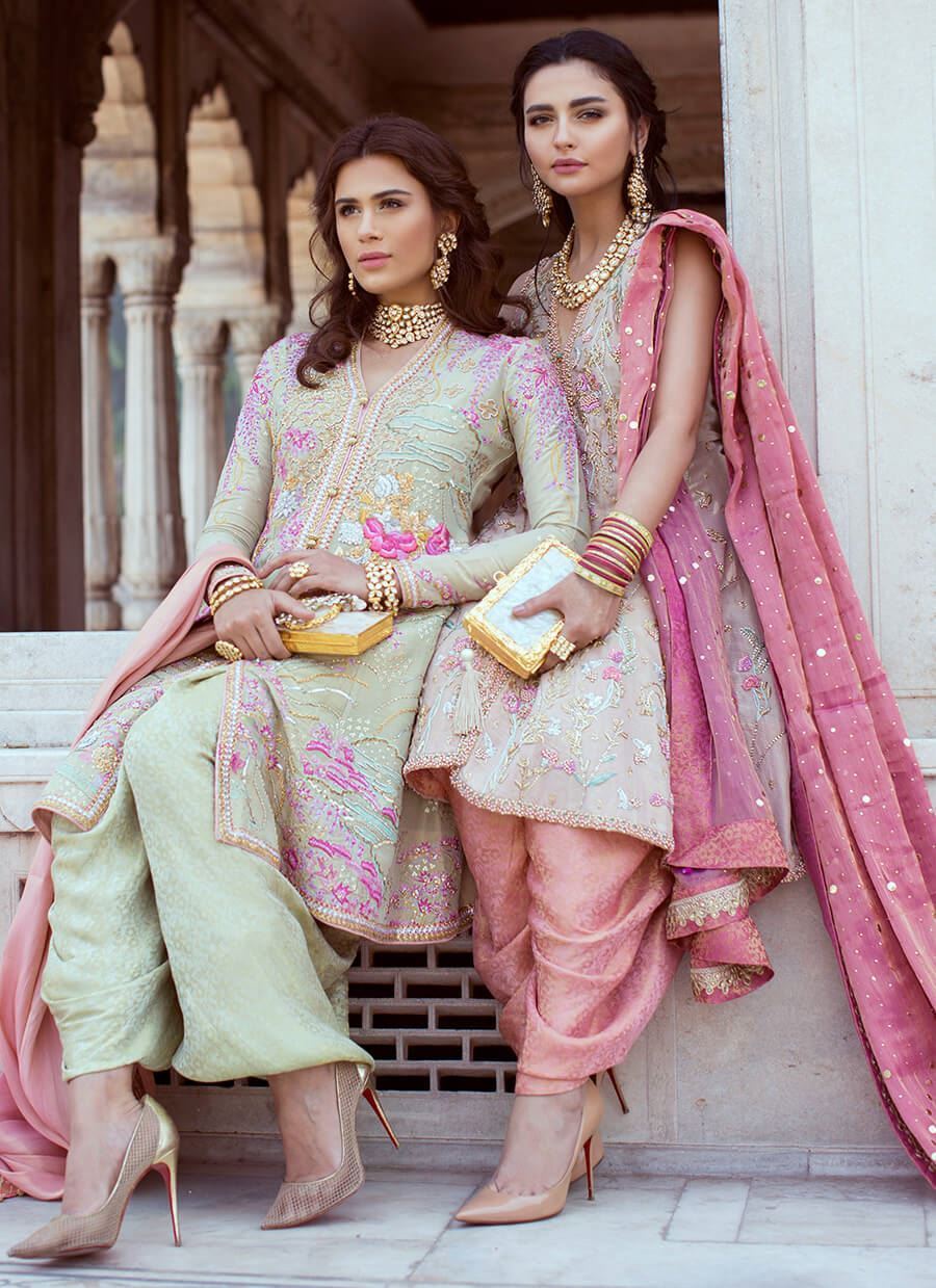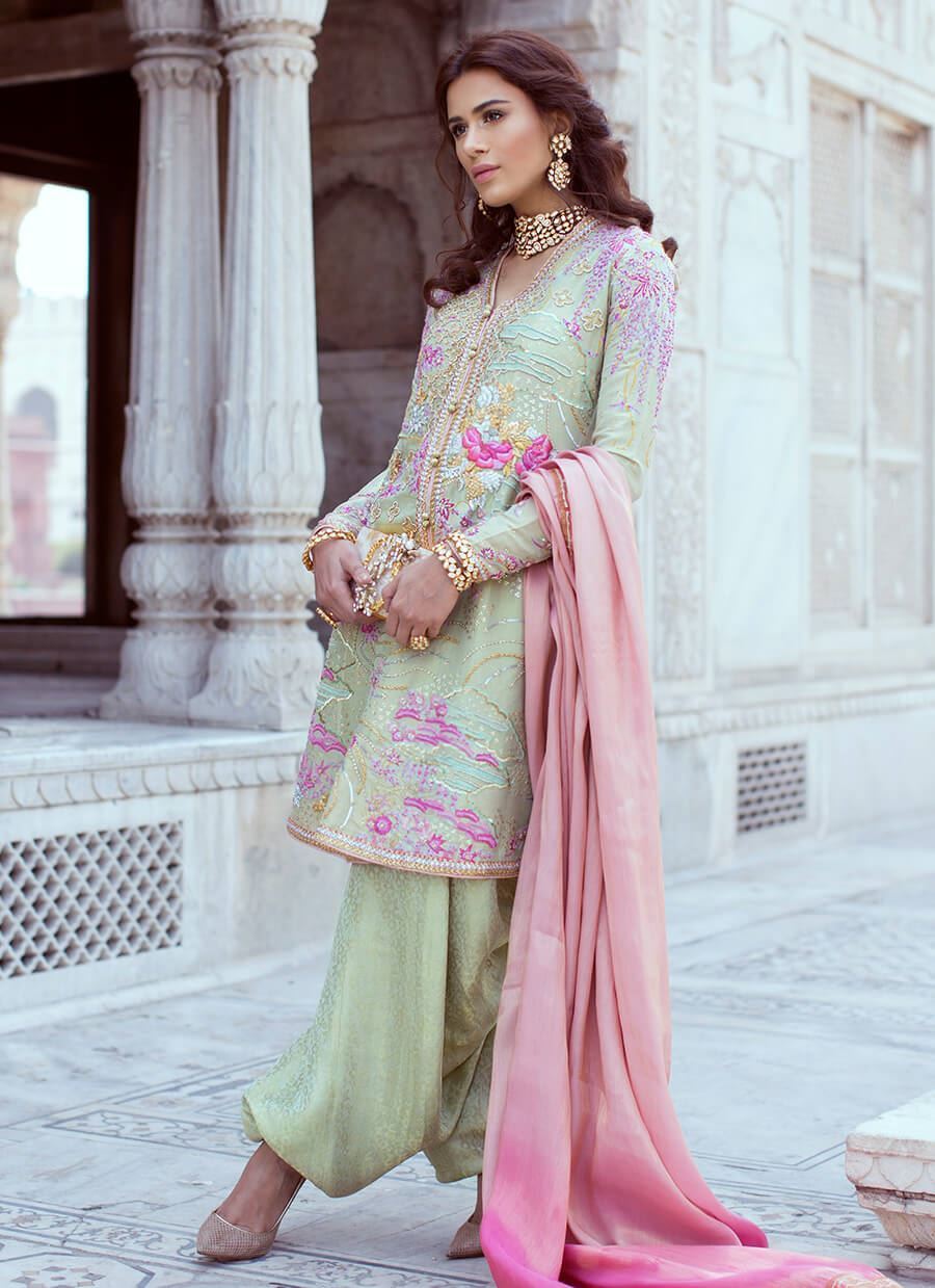 Mint green shirt embroidered in shades of pink on lustrous silk fabric. It comes with a ghera shalwar and is complimented by a peach soft tissue dupatta with border finishing.