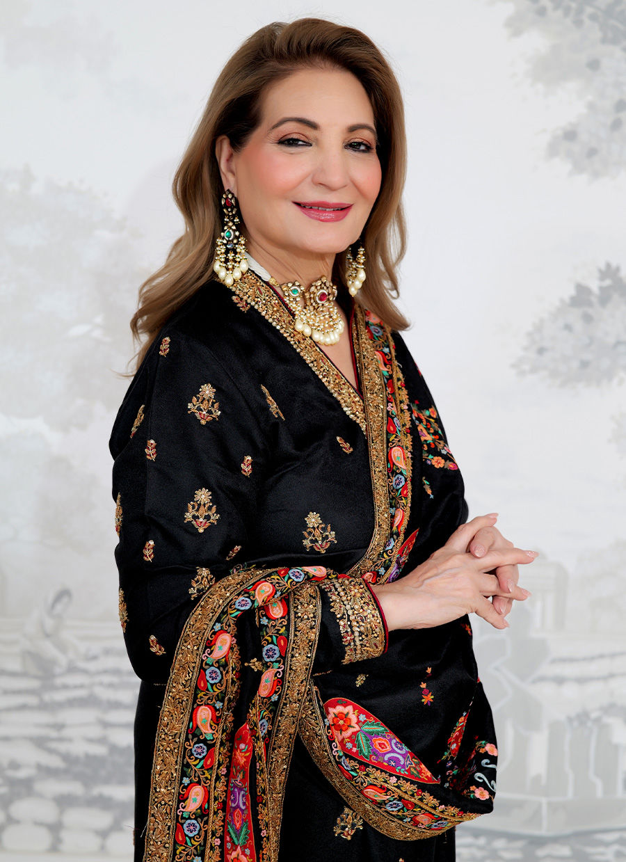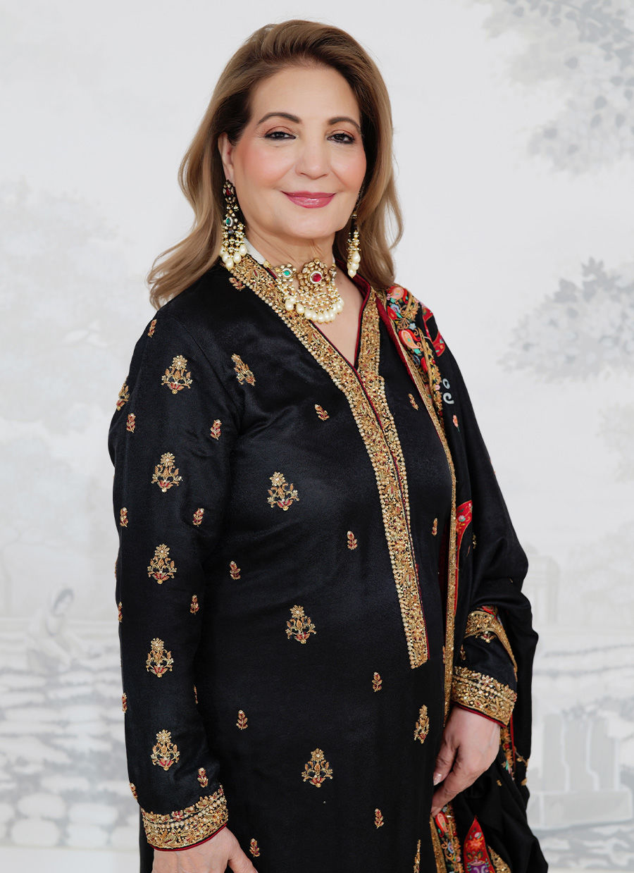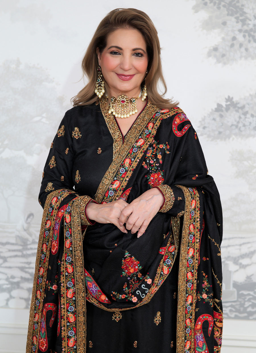 An elegant black pure self jamawar ensemble, adorned with intricate hand embellishments in resham, zari, and sequins. The flattering cut is paired with a richly detailed miniature chaadar, showcasing vibrant multicolored embroidery and a heavily worked border that exudes timeless regality. Perfect for formal occasions, this piece embodies the beauty of heritage craftsmanship with a modern charm.