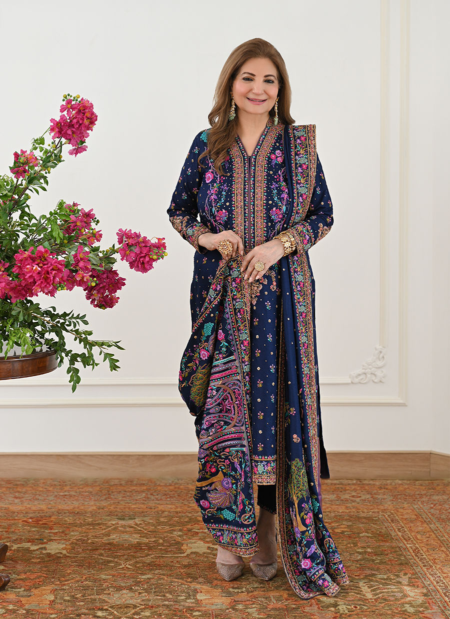 The most flattering cut boasting our favorite colour, an enticing midnight blue. A myriad of peacock colours with delicate mughal embroideries as well as playful tapestries and intricate gota motifs. Meticulous play of colors enhances the zardozi, ari and thread work add a festive element to the outfit. A straight cut with a talpat neckline makes this outfit easy to wear on every body type. It is paired with a pure self jamawar with an intricate hand embellished border which adds to the regal look of the ensemble.