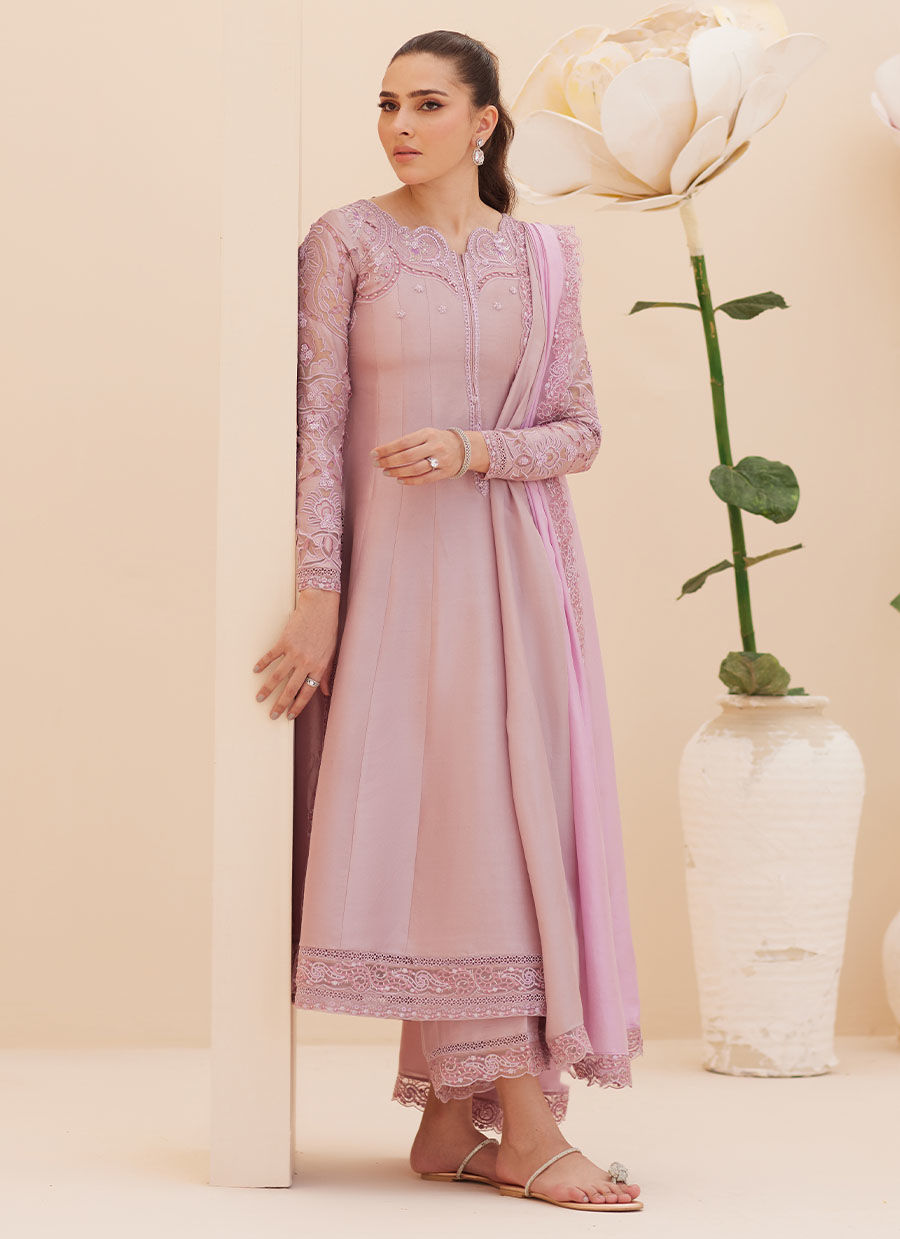 A refreshing shade of mauve raw silk with delicate, pearl motifs all over is the ultimate must have for this spring.The graceful, much loved silhouette has a universally flattering neckline, is gorgeously hand worked with pearls, sequins. The neckline, sleeves and hem feature absolutely eye catching, cutwork with organza layered underneath. A pure medium silk dupatta with embroidered borders complete your outfit with graceful flair. Pair yours with our pure raw silk pants (as shown), and minimal earrings for a stunning look, no matter the occasion