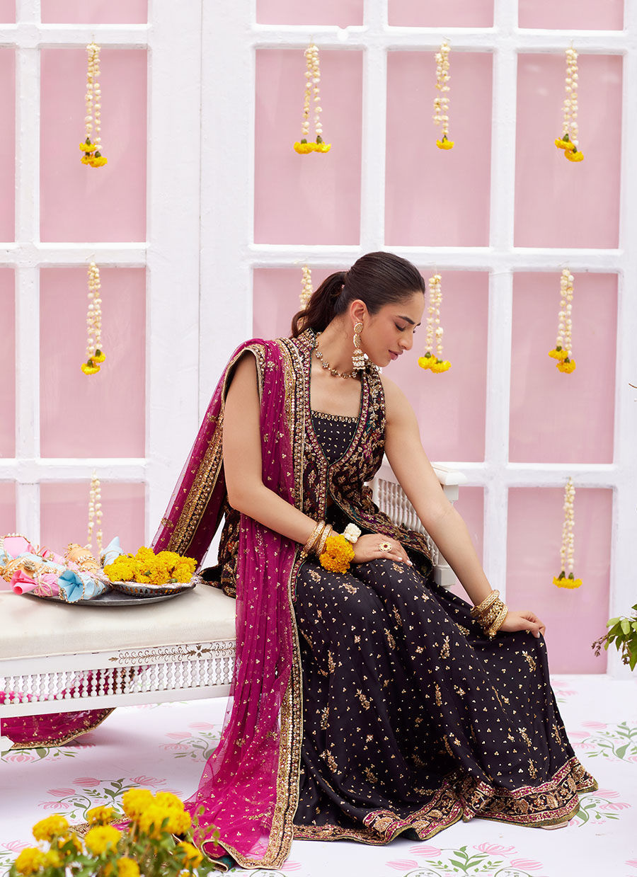 Color: Black Fabric: Shamoz Silk, Pure Raw Silk and Net Work Details: Embroidered and Embellished
