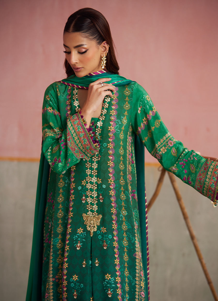 Color: Vibrant Green Ombre Digital Print Fabric: Shirt: Pure Crepe - Pants: Pure Raw Silk Izaar - Dupatta: Pure Medium Silk