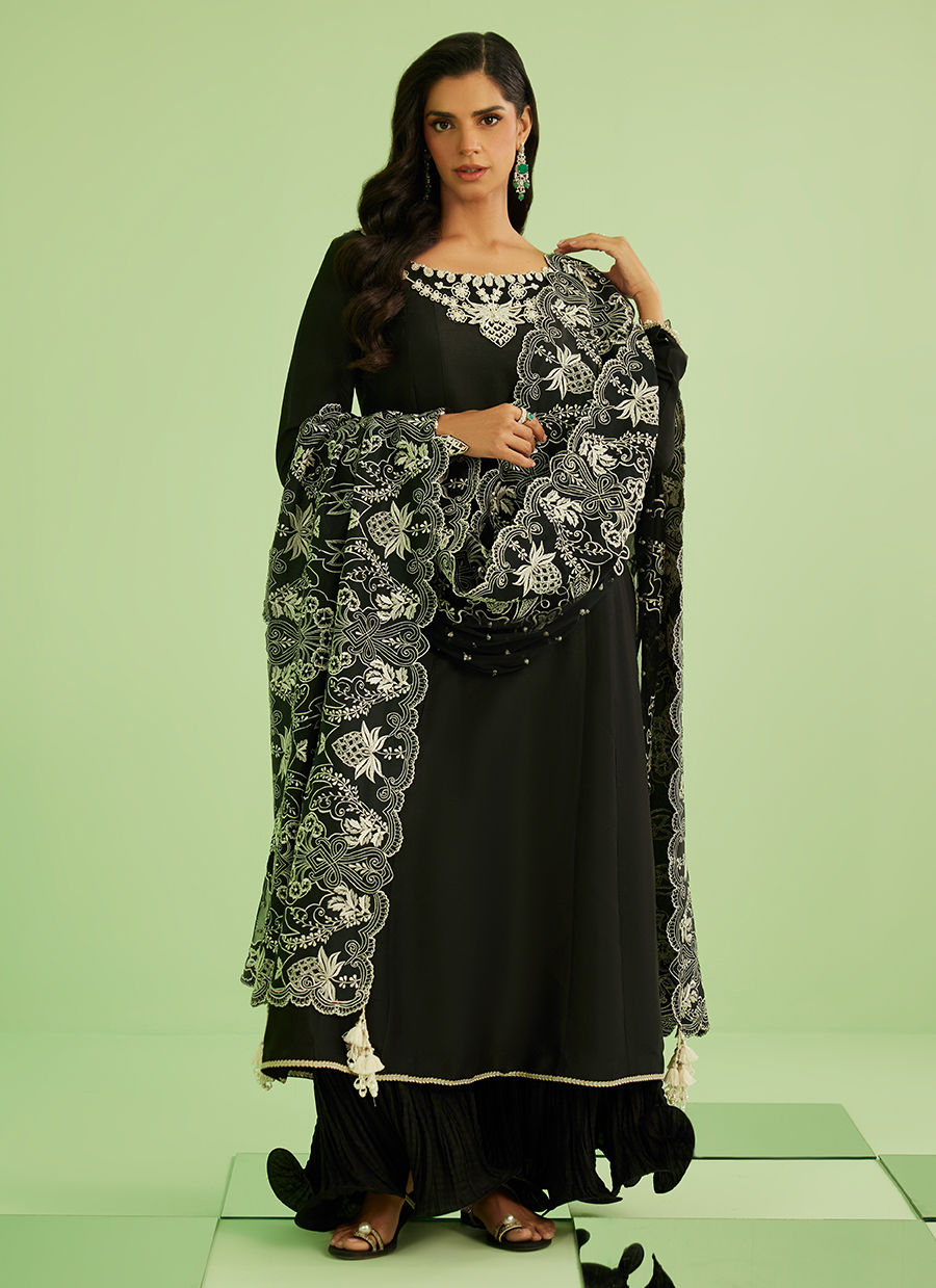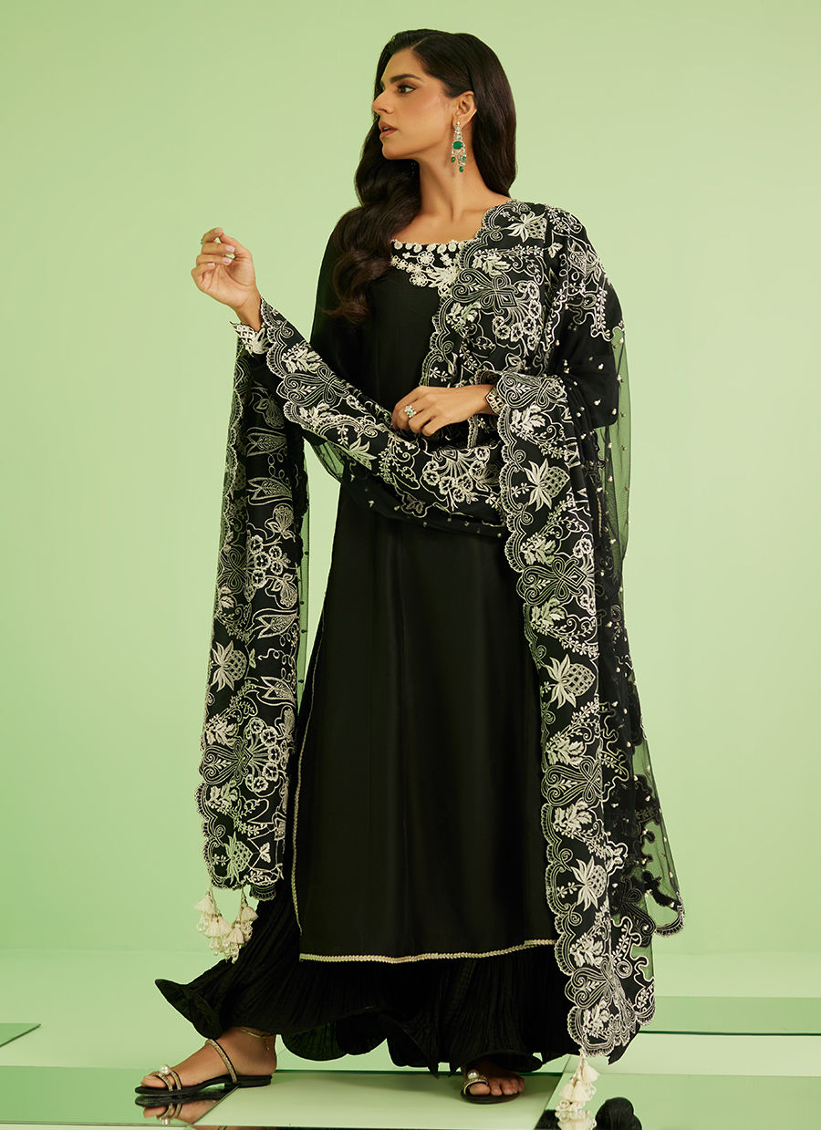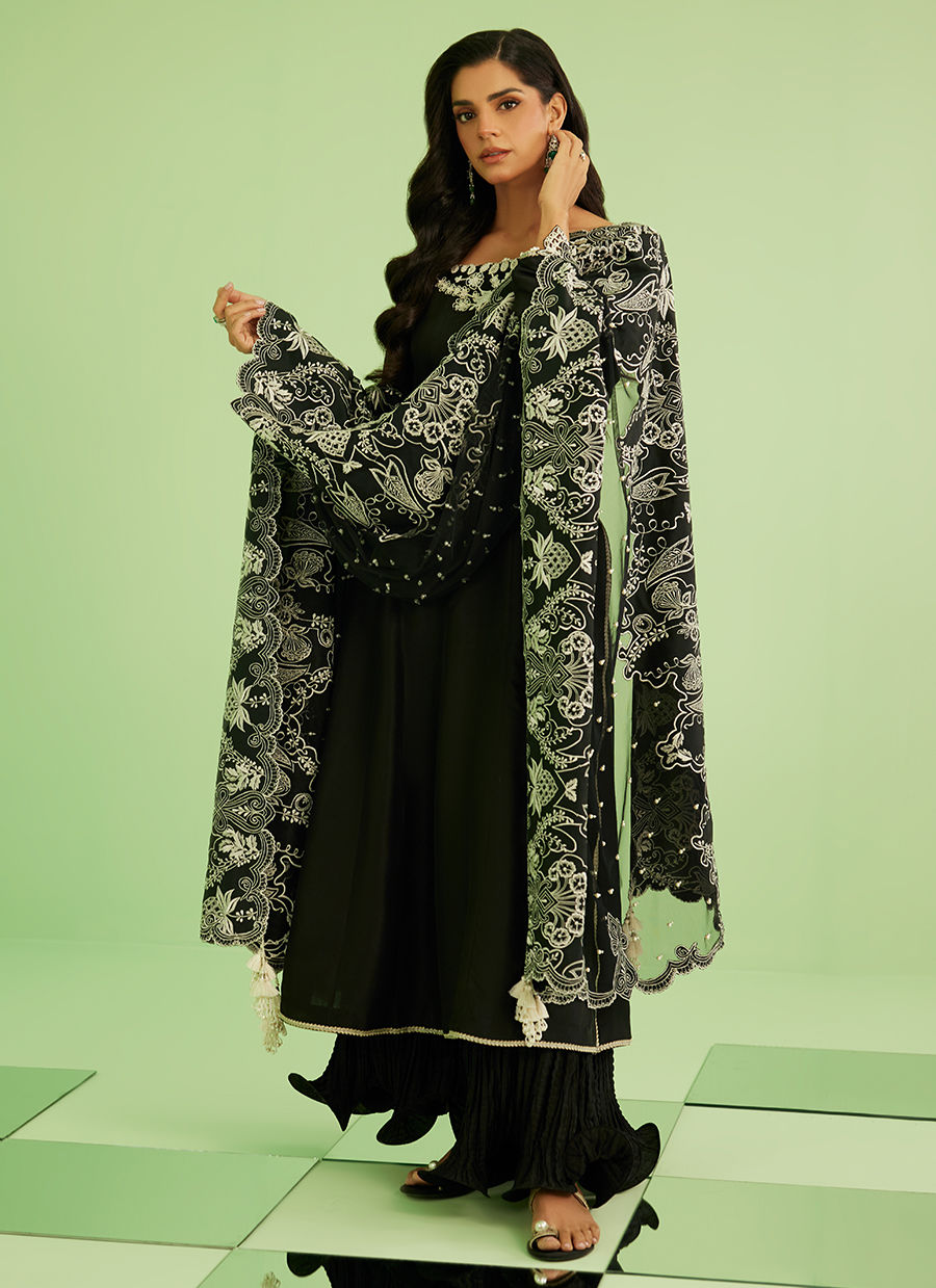 Color: Jet Black with Ivory Embroidery Accents Work Details: Intricately embroidered neckline featuring delicate ivory threadworkNet dupatta adorned with detailed embroidery and scalloped raw silk bordersKhalidar enhanced with subtle chan texture, adding depth and richnessFinished with fine craftsmanship for a refined, luxurious appeal