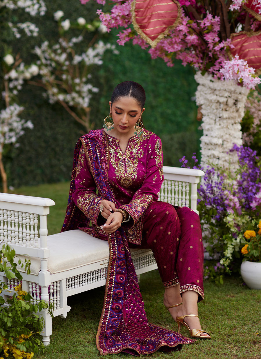 Nura Magenta Shirt and Dupatta This deep magenta ensemble combines rich fabrics and intricate embellishments for a luxurious and sophisticated look. The shirt is crafted from block-printed charmeuse silk, with exquisite zardozi work accentuating the neckline, sleeves, daaman, and side slits. Embellishments include crystals, kora, dabka, sequins, badla wire, and delicate sequin sprays. The daaman and sleeve openings feature block-printed borders, also adorned with zardozi, adding a refined finishing touch. The shalwar is made from self jamavar fabric, detailed with zari bootis and narrow block-printed borders at the hem, enhanced with delicate zardozi embroidery. Completing the look is a charmeuse silk dupatta in harmonious shades of deep magenta, purple, candy pink, and maroon. The dupatta is adorned with carefully composed sequin embellishments that complement the overall design. This ensemble is perfect for festive occasions and formal events where elegance meets traditional artistry.