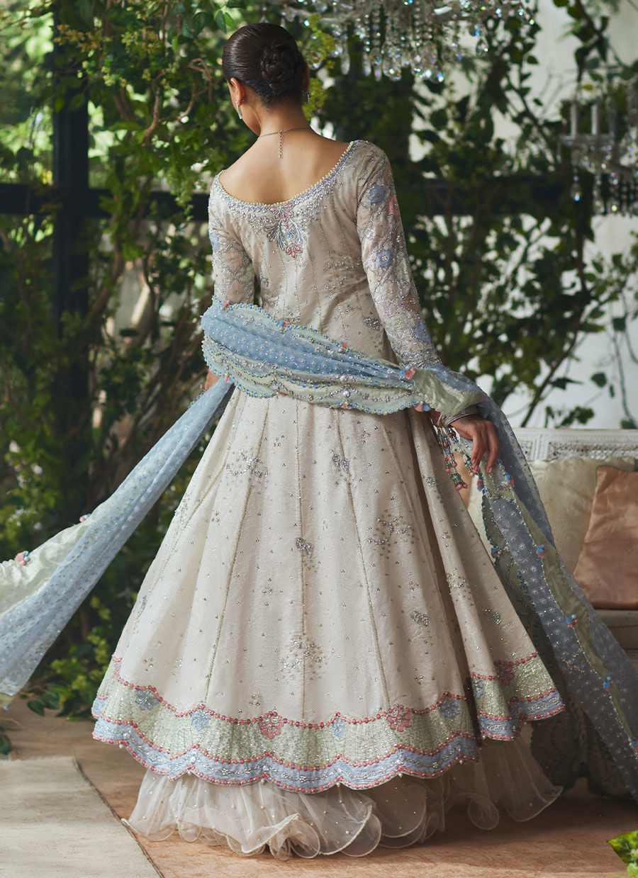 A timeless vision of opulence, this silver zari kalidaar is exquisitely crafted for the modern bride with a love for classic craftsmanship. The neckline is richly embellished with a mix of pearls, stones, sequins, dabka, gotta, mukaish, and bold contrasting appliqués — creating a stunning interplay of texture and sheen.
