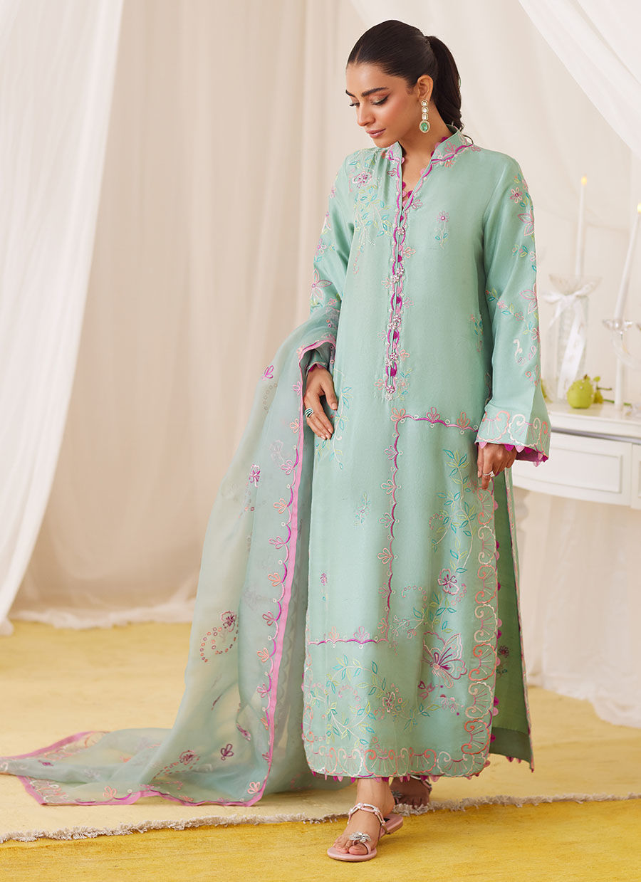 The Petra Fern outfit embraces modern elegance with traditional charm. Pure raw silk in a soothing seafoam green hue is paired with intricate threadwork, primarily floral motifs in gorgeous pastel hues to create an easy to wear, yet versatile look. The pure organza dupatta with embroidered borders gracefully completes your ensemble. Style yours with our matching pure silk izaar and some sparkly flats to steal the show!