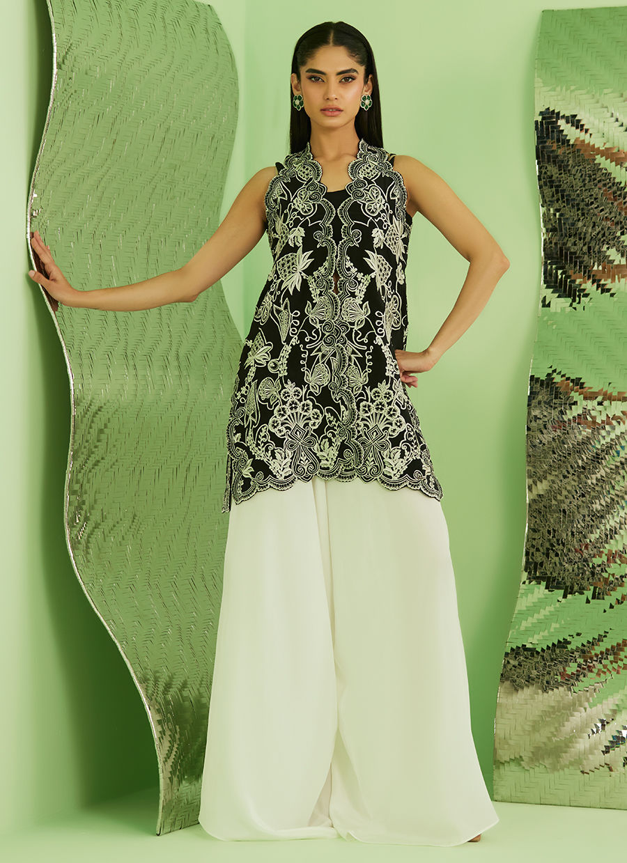 This contemporary ensemble features a structured sleeveless shirt paired with a fluid, ivory pants creating a silhouette that is both powerful and graceful. Set against a deep black base, the look is elevated with intricate ivory-toned embroidery that unfolds across the shirt in an ornate, statement pattern.
