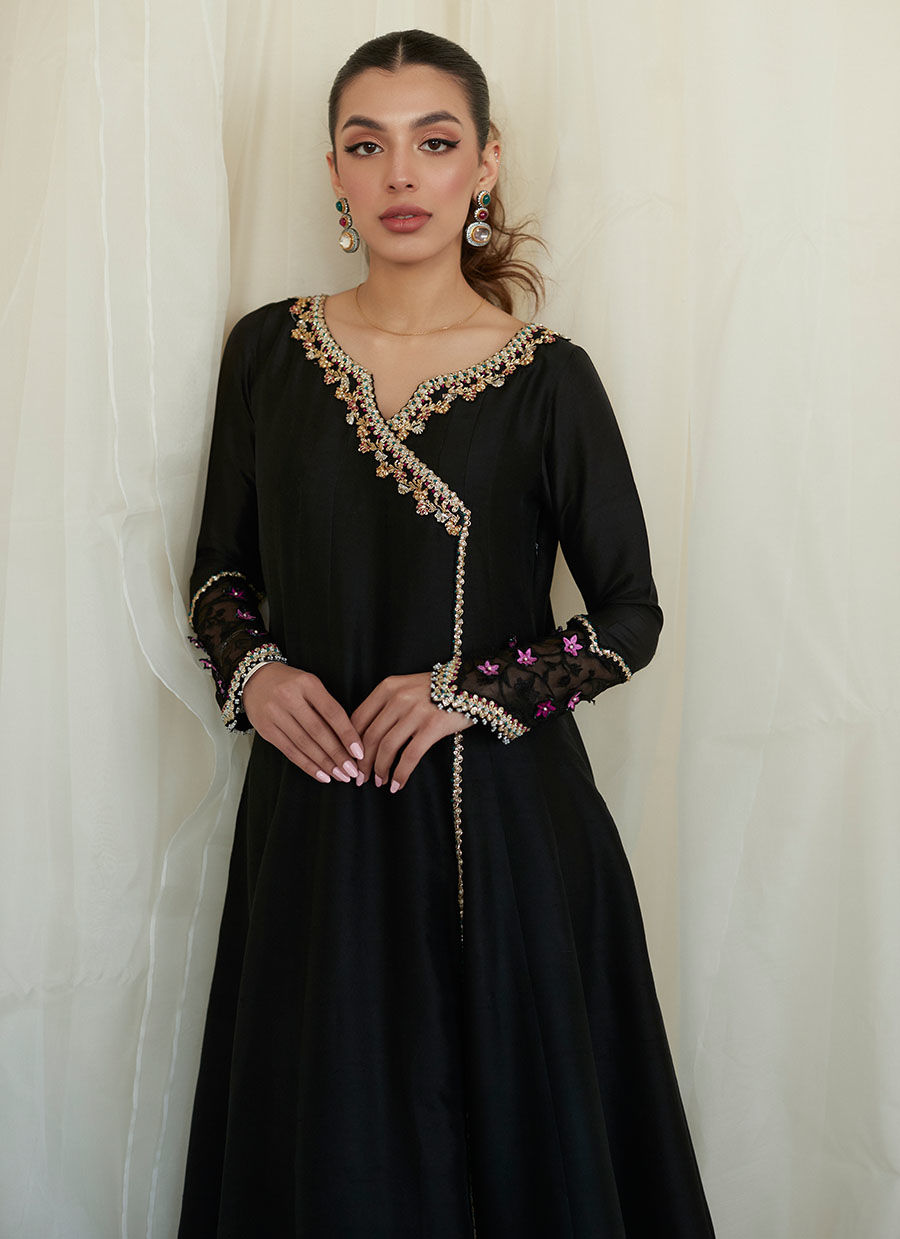 You can never go wrong with black! Especially the decadent combination of gold hand embellishments on a pure black silk, offset with vibrant magenta and teal. The gorgeous kalidar angharkha silhouette of this universally flattering ensemble is made even more radiant by the liquid fluidity of the luscious, pure silk.